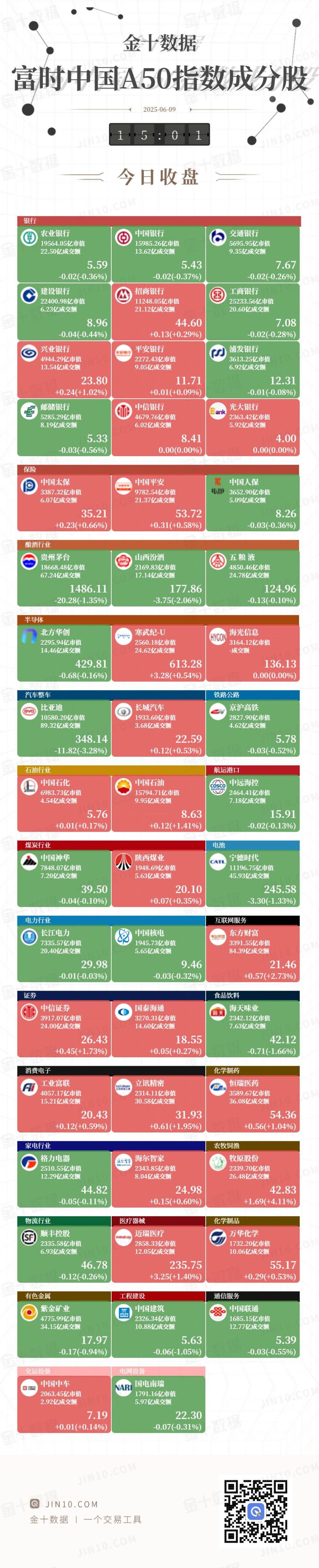 2025-06-09 1 5 : 0 1 1 金十图示:2025年06月09日(周一)富时中国A50指数成分股今日收盘行情一览:消费电子股走强,酿酒行业偏软 十载优 TEA50指数成 银行 农业银行 中国银行 交通银行 9564.05亿市值 15985.26亿市值 695.95亿市值 22.50亿成交额 13.62亿成交额 9.35亿成交额 5.59 5.43 7.67 -0.02(-0.36%) -0.02(-0.37%) -0.02(-0.26%) 建设银行 招商银行 工商银行 22400.98亿市值 11248.05亿市值 25233.56亿市值 21.12亿成交额 6.23亿成交额 20.60亿成交额 8.96 44.60 7.08 +0.13(+0.29%) -0.04(-0.44%) -0.02(-0.28%) 兴业银行 平安银行 浦发银行 4944.29亿市值 2272.43亿市值 3613.25亿市值 13.54亿成交额 9.05亿成交额 6.92亿成交额 11.71 12.31 23.80 +0.24(+1.02%) +0.01(+0.09%) -0.01(-0.08%) 邮储银行 中信银行 ...