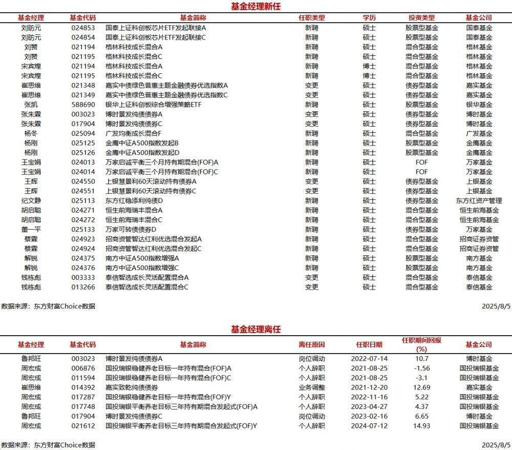 每经AI快讯,据东方财富Choice数据统计,今日新聘基金经理16人,涉及26只基金(A/C类分开计算),主要来自格林基金、万家基金等公 司。另外,今日有3位基金经理离任。 每日经济新闻 | 基金经理 | 基金代码 | 基金简称 | 离任原因 | 任职日期 | 甘肃到同可报 | 其金公司 | | --- | --- | --- | --- | --- | --- | --- | | | | | | | (%) | | | 鲁邦旺 | 003023 | 博时景发纯债债券A | 岗位调动 | 2022-07-14 | 10.7 | 博时基金 | | 周宏成 | 006876 | 国投瑞银稳健养老目标一年持有混合(FOF)A | 个人辞职 | 2021-08-25 | -1.56 | 国投瑞银耳会 | | 周宏成 | 011594 | 国投瑞银稳健养老目标一年持有混合(FOF)C | 个人辞职 | 2021-08-25 | -3.1 | 国投瑞银基金 | | 舞蹈得 | 014392 | 嘉实致乾纯债债券 | 业务调整 | 2021-12-20 | 12.69 | 第二章寺 | | 周宏成 | 017287 | 国 ...