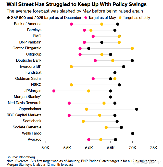 华尔街机构反复调整对美股的预测 当大多华尔街预测者在4月的恐慌性抛售中转向悲观时,摩根士丹利的Michael Wilson和前富国证券策略 师Christopher Harvey却逆势坚守看涨立场。如今,市场证明他们是对的。 自4月抛售潮以来,美国股市几乎无视美国总统唐纳德.特朗普的贸易战所带来的经济风险,反而一路攀 升至历史新高。这一涨势得益于对人工智能技术进步的押注以及低于预期的关税税率。最新一轮上涨的 动力源于一份通胀报告,该报告巩固了美联储将于下个月恢复降息的预期。 标普500指数从4月份的低点上涨了30%,这迫使4月份放弃看涨观点的卖方策略师再次转变立场,上调 预测以跟上很少有人预见到的迅猛涨势。 Roundhill Investments首席执行官Dave Mazza表示:"当市场消息转为负面时,人们很容易退缩,但这往 往是纪律最为重要的时候。优秀的策略制定者会相信自己的方法,而非市场的变化无常。而现在,对于 那些没有退缩的人来说,这种纪律显得非常明智。" 与此同时,Wilson将自己的乐观情绪归因于摩根士丹利的一项情绪指标,该指标在4月7日显示出"明显 抛售"的现象,此外,每股收益修正广度大幅回 ...