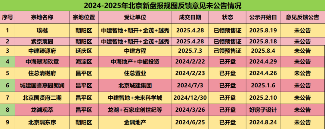| | | | 2024-2025年北京新盘报规图反馈意见未公告情况 | | | | | | --- | --- | --- | --- | --- | --- | --- | --- | | 序号 | 宗地名称 | 宗地位置 | 受让单位 | 成交日期 | 状态 | 公示开始日 | 意见反馈公告 | | 1 | 璞越 | 朝阳区 | 中建智地+朝开+金茂+越秀 | 2025.4.28 | 已领预售证 | 2025.8.19 | 未公告 | | 2 | 紫京宸园 | 朝阳区 | 中建智地+朝开+金茂+越秀 | 2025.4.28 | 已领预售证 | 2025.8.18 | 未公告 | | 3 | 中建葵源府 | 延庆区 | 中建方程 | 2025.7.3 | 已领预售证 | 2025.8.4 | 未公告 | | ব | 中海翠湖玖章 | 海淀区 | 中海地产+中旅投资 | 2024/2/22 | 리 개설 | 2024.4.29 | 未公告 | | ટ | 住总清越府 | 昌平区 | 住总置业 | 2024/2/23 | 已开發 | 2024.4.26 | 未公告 | | ଚ | 城建国誉燕园朗润 | 昌平区 ...