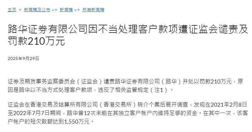 9月29日,据香港证监会网站消息,香港证监会谴责路华证券有限公司(下称"路华")并处以罚款210万港元,原 因是路华以不当方式处理客户款项,违反了相关监管规定。 香港证监会在香港交易所转介个案后展开调查,发现在2021年2月8日至2022年7月7日期间,路华曾12次未能在其 独立客户账户内维持足够的资金。在其中一次,该客户账户的短欠数额达到1550万港元。 事件源于路华动用该客户账户内的资金,以应付由香港交易所发出或预计发出的追缴保证金通知、未妥善管理其 每日网上银行转账限额,以及其员工犯下的人为错误。 香港证监会认为,路华的缺失构成违反《证券及期货(客户款项)规则》及《证券及期货事务监察委员会持牌人 或注册人操守准则》。在决定采取上述纪律处分时,香港证监会已考虑到以下所有相关情况,包括:没有客户因路华 的缺失而蒙受损失;路华已采取补救行动,包括加强其内部监控措施及流程,以及在各事件发生后立即纠正客户款项 未获充分分隔的情况;路华在解决香港证监会提出的关注事项方面表现合作;及路华以往并无遭受纪律处分的记录。 ...