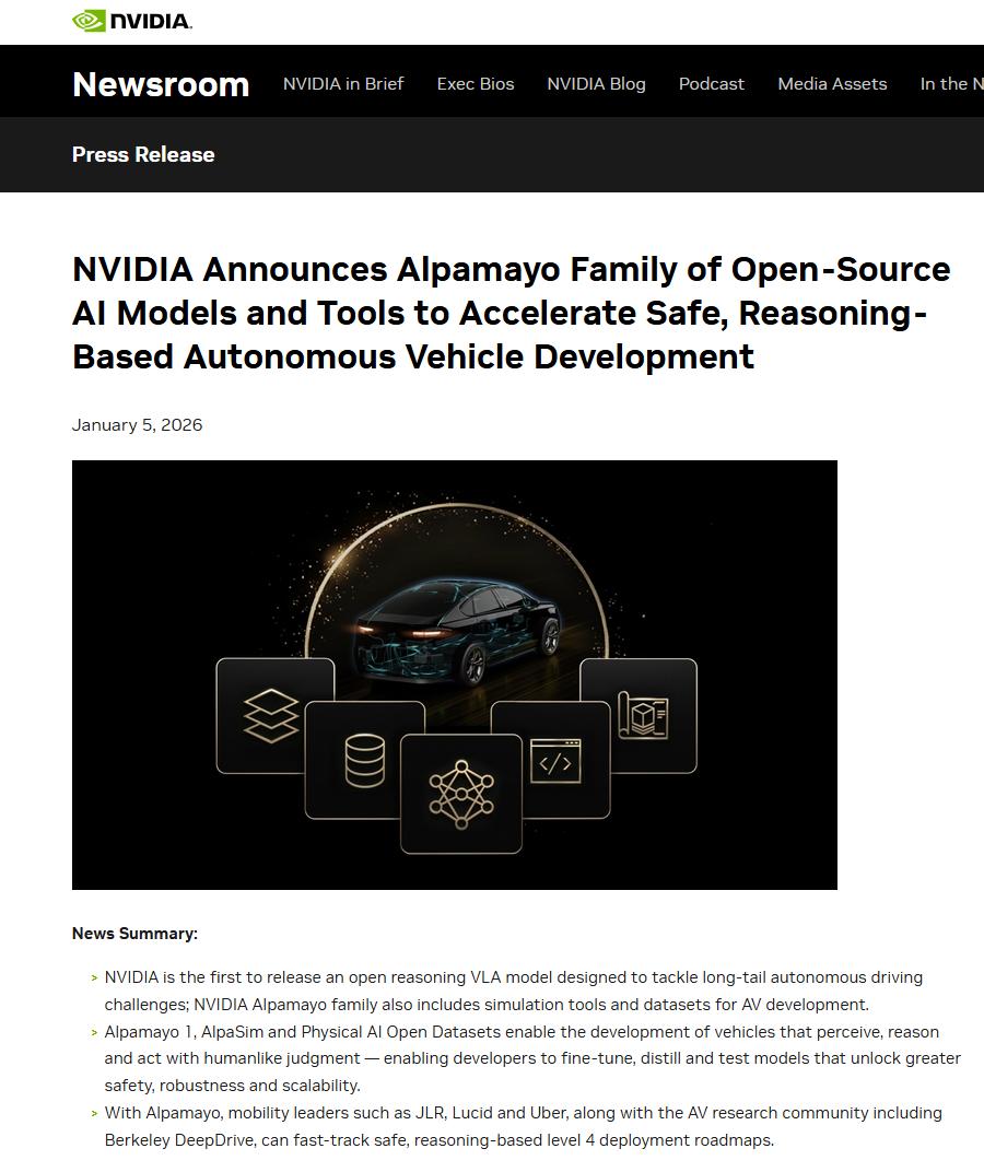 公司战略与愿景 - 公司在2026年国际消费电子展上高调宣传人形机器人技术与全新自动驾驶汽车模型系列Alpamayo [1] - 公司首席执行官黄仁勋表示,众多企业包括波士顿动力、卡特彼勒、LG电子和NEURA Robotics等都在使用其机器人技术来开发和驱动各种机器人 [1] - 公司声称物理人工智能可以彻底改变规模达50万亿美元的制造业和物流业,并希望成为该领域的核心 [1] - 公司在CES上发布了一系列新的AI模型,旨在帮助训练机器人与世界互动,并提供驱动其数字大脑所需的硬件 [1] 自动驾驶技术突破:Alpamayo模型 - Alpamayo是一个全新的自动驾驶汽车模型系列,采用基于思维链推理的视觉-语言-动作模型,旨在加速下一代安全、基于推理的自动驾驶汽车开发 [2] - 该模型能够识别在正常驾驶中可能不会出现的独特驾驶情况,并找出正确的行驶方式,例如在交通信号灯故障时检测问题并决定下一步行动 [2] - 公司解释称,自动驾驶汽车面临的最大挑战之一是应对罕见且复杂的“长尾”场景,传统架构将感知和规划分离,限制了系统在新情况下的可扩展性 [6] - Alpamayo系列引入了基于推理的VLA模型,将类人思维引入决策过程,使系统能够逐步思考新颖或罕见的场景,从而提升驾驶能力和可解释性 [6] - 黄仁勋称Alpamayo为自动驾驶汽车带来了推理能力,使它们能够思考罕见场景,在复杂环境中安全驾驶并解释其驾驶决策,这是安全、可扩展自动驾驶的基础 [8] - 公司决定免费开放Alpamayo模型,允许潜在用户自行对模型进行重新训练,这些模型旨在作为“教师大模型”,供开发者微调并提炼成其完整自动驾驶堆栈的骨干 [8] - Alpamayo的作用是帮助开发者不断改进他们的自动驾驶汽车技术 [9] 产品商业化进展与行业支持 - 首款搭载公司技术的汽车将于第一季度在美国上路 [2] - 包括Lucid、捷豹路虎、Uber和Berkeley DeepDrive等车企都对Alpamayo表现出兴趣,希望开发基于推理的自动驾驶堆栈以实现L4级自动驾驶 [10] - Lucid Motors高管表示,向物理人工智能的转变凸显了对能够推理现实世界行为而不仅仅是处理数据的AI系统的需求,并认为先进的仿真环境、数据集和推理模型是重要要素 [10] - 捷豹路虎高管认为,通过开源Alpamayo等模型,公司正在帮助加速整个自动驾驶生态系统的创新,为开发者和研究人员提供新工具以安全应对复杂的现实世界场景 [10] - Uber高管指出,应对长尾和不可预测的驾驶场景是关键挑战,Alpamayo为行业创造了令人兴奋的新机遇,可以加速物理AI、提高透明度并增加安全的L4级部署 [10] - 标普全球高级首席分析师表示,Alpamayo使车辆能够解读复杂环境,预测新情况并做出安全决策,即使在从未遇到过的场景中也是如此,其开源特性加速了整个行业的创新 [10] - Berkeley DeepDrive联合主任称,Alpamayo产品组合的发布对研究界是一次重大飞跃,其开源决定具有变革性意义,提供的访问权限和功能将使研究界能够以前所未有的规模进行训练 [10]