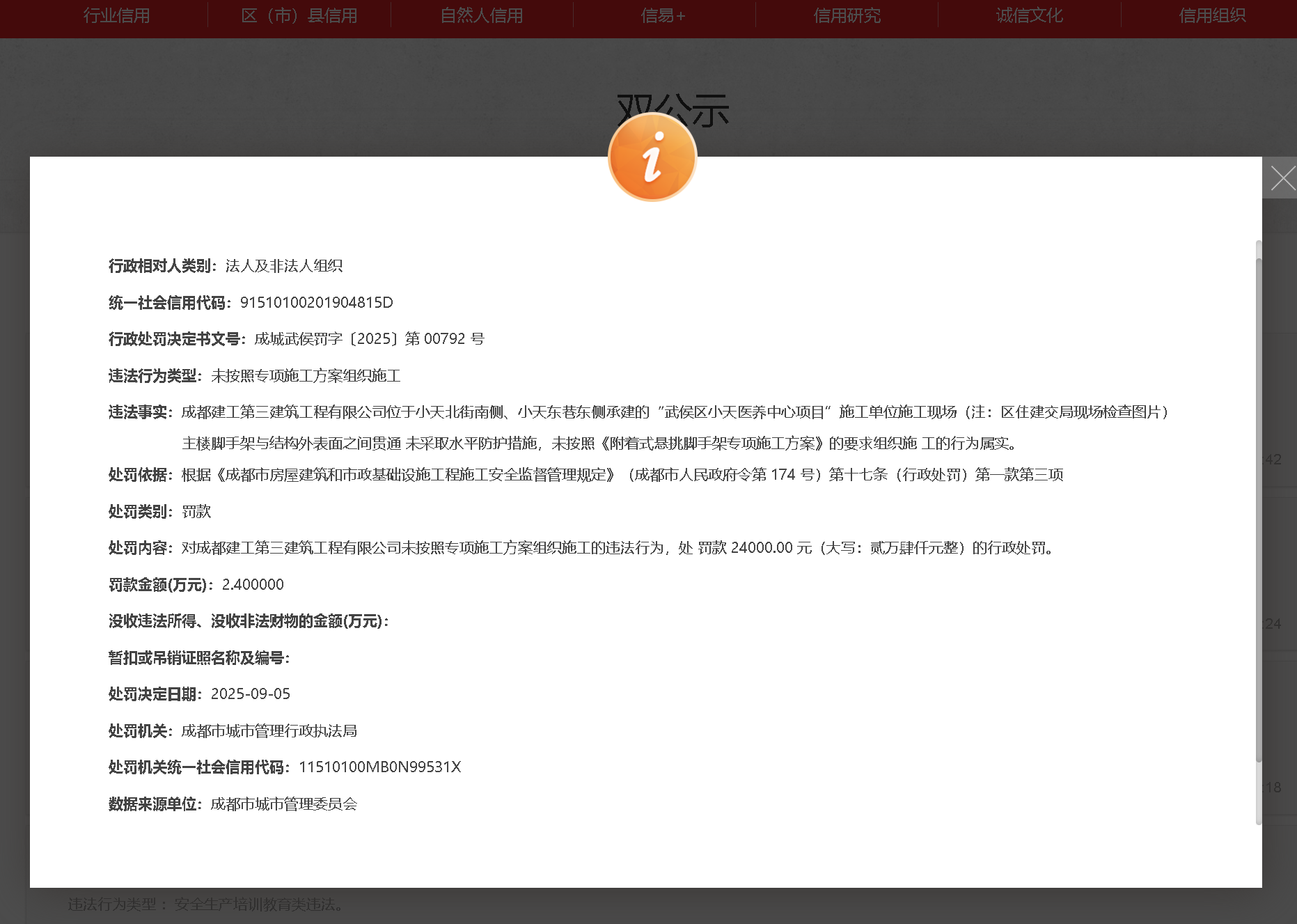 公司违规处罚事件 - 成都建工第三建筑工程有限公司因未按专项施工方案组织施工被成都市城市管理行政执法局罚款2.4万元 [1] - 违法行为具体表现为武侯区小天医养中心项目脚手架与结构外表面之间贯通未采取水平防护措施 违反《附着式悬挑脚手架专项施工方案》要求 [1] 公司基本情况 - 公司隶属成都建工集团有限公司 始建于1965年7月 拥有近60年经营历史 [3][5] - 企业资产总额超100亿元 年施工能力超过100亿元 [3][5] - 自有职工1000余人 其中专业技术人才582人 全国注册一级建造师155人 中高级职称人员423人 [3] 公司资质与业务范围 - 持有工程建设施工组织质量管理 环境管理 职业健康安全管理三体系认证 [5] - 具备建筑工程施工总承包一级 市政公用工程施工总承包一级资质 [5] - 拥有公路工程施工总承包二级 水利水电工程施工总承包二级资质 [5] - 涵盖建筑机电安装 地基基础 装修装饰 消防设施 起重设备安装 防水防腐保温 古建筑工程等专业承包资质 [5]