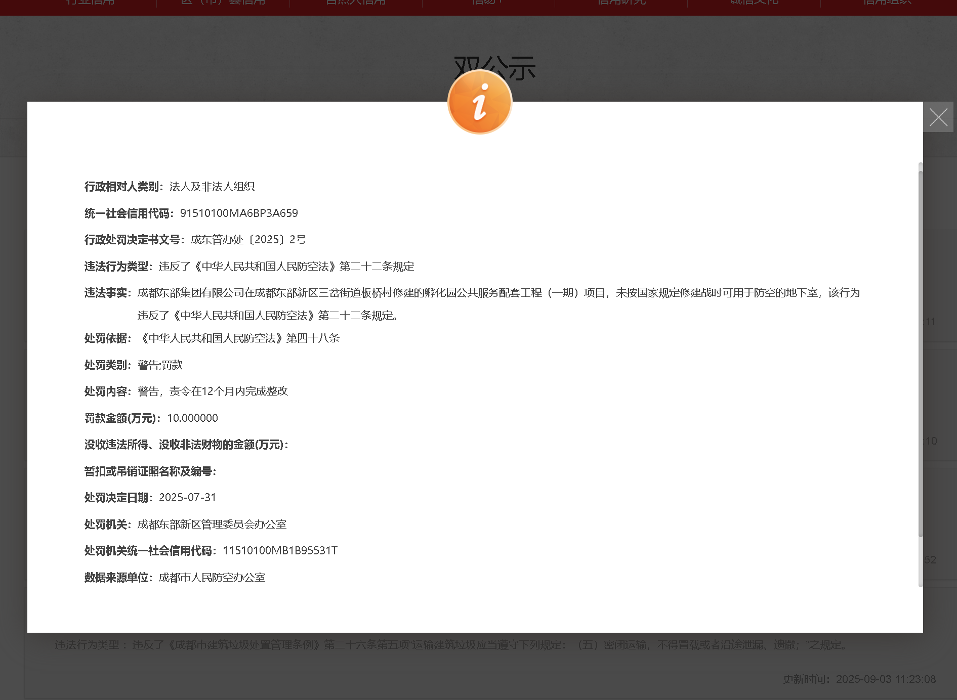 公司违规事件 - 公司因未按国家规定修建战时可用于防空的地下室违反《中华人民共和国人民防空法》第二十二条规定 [1] - 公司被警告并责令12个月内完成整改 同时罚款10万元 [1] 公司背景与业务 - 公司成立于2020年 注册资本金60亿元 [3] - 公司是成都东部新区重要的国有资本投资运营公司 负责国际空港经济区 未来医学城 天府奥体公园及三岔TOD城市核心区的基础设施及配套建设 产业投资 城市开发及运营 乡村振兴等工作 [3]
