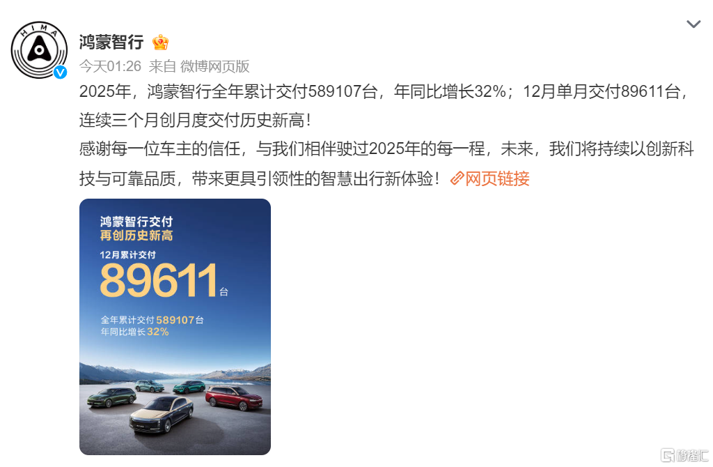 车企2025年12月及全年交付数据 - 鸿蒙智行12月单月交付89,611台,连续三个月创月度交付历史新高,全年累计交付589,107台,年同比增长32% [1] - 零跑汽车12月全系交付60,423台,同比增长42%,全年累计交付596,555台,同比增幅达103% [4] - 小米汽车12月交付量超5万台,产品矩阵计划在2026年推出4款新车,包括SU7改款、SU7行政版、一款增程五座SUV和一款增程七座SUV [6] - 蔚来12月交付新车48,135台,同比增长54.6%,创月度交付历史新高,全年累计交付326,028台,同比增长46.9% [9] - 理想汽车12月交付44,246辆,第四季度总交付量达109,194辆,截至2025年12月31日历史累计交付量为1,540,215辆 [11] - 小鹏汽车12月交付37,508辆,实现同环比双增长,全年累计交付429,445辆,同比增幅高达126% [13] - 极氪汽车12月交付量首次突破3万台,达30,267台,同比增长11.3%、环比增长4.9%,2025年全年累计交付224,133台,较2024年实现同比增长 [16] - 智己汽车2025年销量达81,017台,全年销量再创新高,岚图汽车2025年累计交付150,169辆,实现交付“十连涨”,同比增长87% [19] 2026年汽车行业政策与市场展望 - 2025年底促消费重磅利好政策密集出台,包括国家发展改革委、财政部印发的《关于2026年实施大规模设备更新和消费品以旧换新政策的通知》,以及商务部等8部门发布的《2026年汽车以旧换新补贴实施细则》,对报废旧车并购买新能源乘用车的,最高按新车销售价格的12%给予补贴,补贴金额最高2万元 [19] - 上海、深圳、贵州、海南、黑龙江等地也迅速推出了当地的配套补贴政策 [19] - 乘联分会秘书长崔东树解读称,2026年汽车报废更新补贴相关政策超预期,有利于政策平稳过渡、促进消费升级,预计2026年中国车市将呈现“前低后高”走势,全年整体车市增速应该高于零增长,且1月份会实现“开门红” [19] - 中国汽车流通协会初步测算,享受补贴的乘用车有望超过1200万辆,拉动新车消费近150万辆,2026年汽车以旧换新政策将惠及比2025年更多的消费者 [20] - 开源证券指出,整车板块预期相对较差的情况或已过去,预计后续随着2026年第一季度淡季逐步过去,三四月份开启新品密集发布期,叠加以旧换新政策延续,乘用车需求有望迎来复苏 [20] - 方正证券表示,预计2026年一季度行业内销景气度触底后,有望开启全年重点布局窗口,2026年预计为整车估值驱动出海化元年,建议重视出海端带来的利润结构和估值切换 [20]