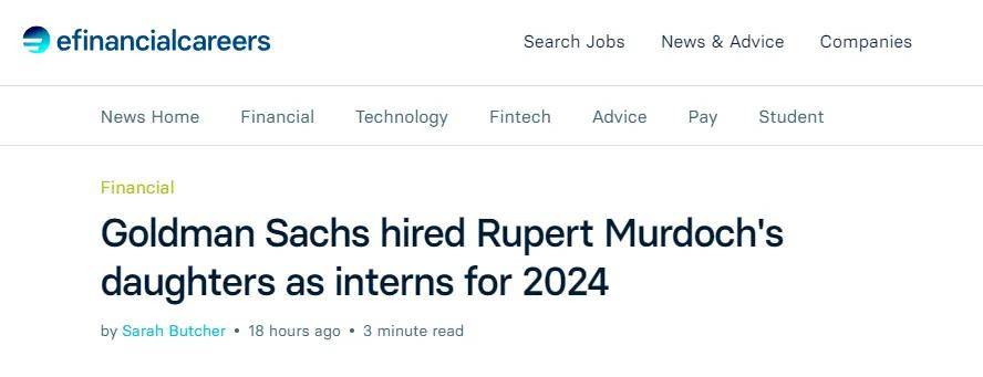 亿万富翁默多克和邓文迪的大女儿Grace日前更新LinkedIn,宣布自己正式加入高盛! 而在早前,Grace 和她的妹妹 Chloe就被曝参加高盛2024暑期实习,并成功进入Consumer & Retail以及TMT组。 结合高盛每年越来越低的录取率来看,这难免让网友们怀疑这到底是带资进组还是靠实力说话。 efinancialcareers专栏作者默默写道:"如果你没能获得 2024 年高盛的实习机会,你可以感到安慰,因为你并不是一个人,毕竟 不是谁的父亲都是亿万传媒大亨。" 但也有金融圈网友表示,超级富豪的孩子原本就更适合干投行,毕竟赚钱游戏是从小就开始耳濡目染的,而且人脉和资金也绝 非普通人能比。 ...