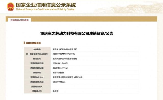中新网1月5日电(吴家驹)国家企业信用信息公示系统显示,近日,重庆车之芯动力科技有限公司新增一 则注销备案公告,注销原因为:因合并或分立,清算组成立日期为2025年11月5日,清算组备案日期为 2026年1月4日。 图自国家 企业信用信息公示系统 重庆车之芯动力科技有限公司成立于2018年12月,法定代表人为马东辉,注册资本8000万人民币,经营 范围包括:从事动力科技、新能源领域内的技术开发、技术咨询、技术转让、技术服务;新能源汽车、 摩托车、电池、充电桩、电子产品(不含电子出版物)、电源及其零部件的研发、生产、销售及维护;货 物及技术进出口。 重庆车之芯动力科技有限公司由江苏心电互动汽车销售服务有限公司全资持股,后者由理想汽车关联公 司Leading Ideal HK Limited全资持股。(完) ...