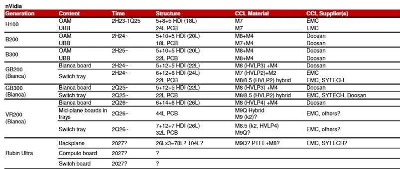 今天市场上消息太多,真假难辨,从光模块到PCB,这种消息是比较麻烦的,不知从何而来。 1、PCB 关于PCB 的传言有两个 : 1\ Rubin机柜switch tray所用pcb材料体系确认升级:原M9树脂+二代玻纤布方案,升级为性能更高的 M9树脂+Q布方案。若采用,Q布需求有望提升600万米至1500万米,考虑备货有望达到2000万米以 上 2\ GoogleTPUV8考虑升規至EM896K3(Q-glassM9) 关于这个问题,咨询了产业内的很多朋友,也包括CCL原厂的朋友,关于Rubin的Switch tray, 台光 那边还并没有确认到是否的确升级到了M9 + Q布的方案 。但midplane已经基本确认是使用M9了。 | nVidia | | | | | | | | --- | --- | --- | --- | --- | --- | --- | | Generation | Content | Time | Structure | CCL Material | CCL Supplier(s) | PCB Supplier(s) | | H100 | OAM | 2H23-1Q25 | 5+8 ...