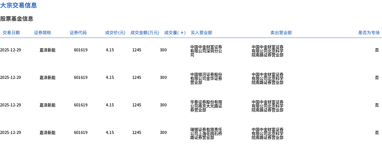 | 交易日期 | 证券简称 | 证券代码 | | | 成交价(元) 成交金额(万元) 成交量(*) 买入营业部 | | 卖出营业部 | | --- | --- | --- | --- | --- | --- | --- | --- | | 2025-12-29 | 嘉泽新能 | 601619 | 4.15 | 1245 | 300 | the property of the comments of the first | 看閱公言的書類學 | | 2025-12-29 | 嘉泽新能 | 619101 | 4.15 | 1245 | 300 | 于成功 直限公司等 | 是環公景的書類姿 | | 2025-12-29 | 嘉泽新能 | SISTOR | 4.15 | 1245 | 300 | 芬版份有限 | | | 2025-12-29 | 嘉洋新能 | 601619 | 4.15 | 1245 | 300 | 公司 | | 12月29日,嘉泽新能大宗交易成交1200万股,成交额4980万元,占当日总成交额的10.88%,成交价4.15元,较市场收盘价4.66元折价10.94%。 ...