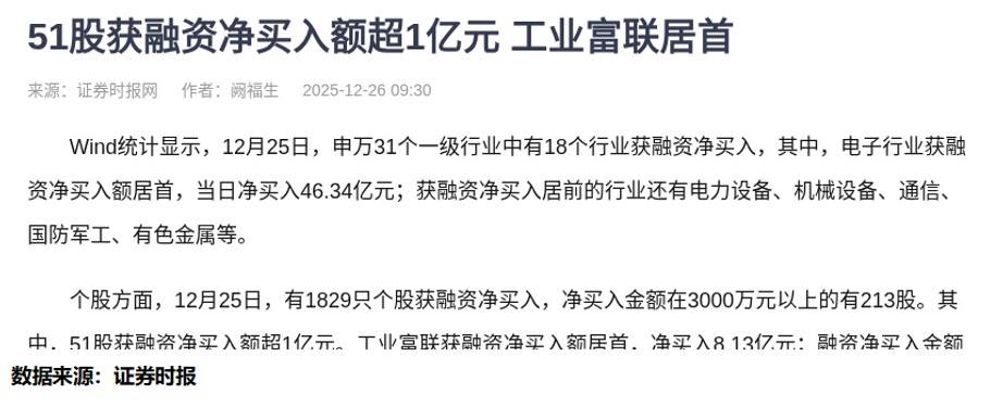 文章核心观点 - 2025年A股融资市场大幅扩张,融资余额创历史新高,全年净增长6700亿元至2.52万亿元,增幅超36% [1][3] - 融资资金高度集中于科技成长行业,电子行业以超1600亿元净买入额成为绝对主线,融资客的宠儿从光模块龙头向算力巨头演变 [1][5] - 个股层面融资集中度极高,新易盛以186亿元净买入额成为年度融资明星股,其业绩与融资买入共振 [7][9] 年度增长 - 截至12月25日,A股融资余额达2.52万亿元,较2024年底的1.85万亿元净增长6700亿元,增幅超过36% [1][3] - 增长贯穿全年,12月23日融资余额首次站上2.5万亿元大关,达到25145.96亿元 [3] - 全年增长规模已逼近2014年牛市时期全年6739亿元的增额 [1] 行业角逐 - 31个申万一级行业中,28个行业获融资净买入,仅石油石化、煤炭、食品饮料三个行业为净卖出 [5] - 电子行业以1606亿元净买入额遥遥领先,占全年融资净买入总额的24% [1][5] - 电力设备行业以947亿元净买入额位居第二,占比14%;通信行业获648亿元净买入,占比10% [5] - 下半年资金继续集中,截至12月23日,13个行业融资净买入额超100亿元,电子行业以1614.26亿元继续领跑 [5] 个股龙头 - 全年共有6只个股融资净买入超百亿元 [7] - 新易盛以186亿元融资净买入额高居榜首,下半年获171.63亿元净买入 [7] - 其他净买入超百亿个股包括中际旭创、胜宏科技、宁德时代、寒武纪和阳光电源 [7] - 工业富联、三花智控、中芯国际和海光信息也获得了超过40亿元的融资净买入 [7] 融资明星 - 新易盛为2025年融资市场明星股,截至12月22日融资余额达207.13亿元,占其流通市值4.5% [9][15] - 仅12月15日至19日当周,新易盛获146.63亿元融资买入,为两市最高;12月22日单日融资买入额达33.46亿元 [9] - 公司基本面强劲,2025年1-9月实现营业收入165.05亿元,同比增长221.70%;归母净利润63.27亿元,同比增长284.37% [9] 市场对比 - 融资余额增长与市场走势共振,6月20日至9月25日期间融资余额增长6235亿元,同期上证指数上涨14.6% [11] - 7月份融资资金净买入额超百亿的行业有6个,包括电子、医药生物、电力设备、有色金属、计算机和非银金融 [11] - 资金在交易所间流动存在差异,12月16日上交所融资余额增加55.43亿元,深交所则减少60.41亿元 [11] 增长动力 - 政策支持是重要驱动力,12月初证监会明确提出为优质机构拓宽资本空间与杠杆上限 [13] - 券商积极拓展两融业务,招商证券、浙商证券等多家券商2025年内先后上调两融规模上限,单次最大上调幅度达1000亿元 [13] - 截至11月6日,两融市场平均维持担保比例为281.62%,远高于130%的平仓警戒线 [13][15] 市场特征 - 融资交易额占A股成交额比重升至10.59% [15] - 市场平均维持担保比例保持在281.62%的安全线上方,距离130%的警戒线有充足缓冲空间 [13][15]