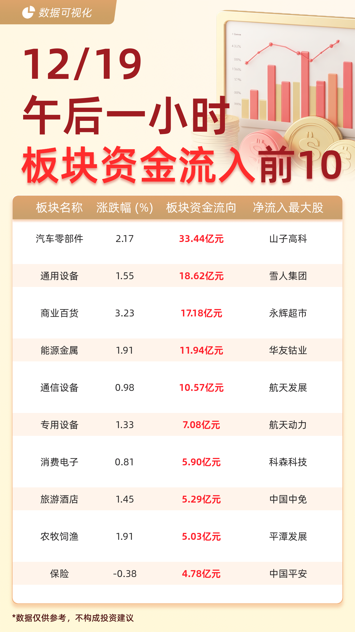 大盘主力资金流向 - 截至12月19日午后一小时,大盘主力资金净流入25.79亿元 [1] 主力资金流入前十大板块 - 汽车零部件板块主力资金净流入33.44亿元,位列第一 [1] - 通用设备板块主力资金净流入18.62亿元,位列第二 [1] - 商业百货板块主力资金净流入17.18亿元,位列第三 [1] - 能源金属板块主力资金净流入11.94亿元,位列第四 [1] - 通信设备板块主力资金净流入10.57亿元,位列第五 [1] - 专用设备板块主力资金净流入7.08亿元,位列第六 [1] - 消费电子板块主力资金净流入5.90亿元,位列第七 [1] - 旅游酒店板块主力资金净流入5.29亿元,位列第八 [1] - 农牧饲渔板块主力资金净流入5.03亿元,位列第九 [1] - 保险板块主力资金净流入4.78亿元,位列第十 [1] 板块内代表性公司 - 汽车零部件板块中,山子高科为代表性公司 [2] - 通用设备板块中,雪人集团为代表性公司 [2] - 商业百货板块中,永辉超市为代表性公司 [2] - 能源金属板块中,华友钴业为代表性公司 [2] - 通信设备板块中,航天发展为代表性公司 [2] - 专用设备板块中,航天动力为代表性公司 [2] - 消费电子板块中,科森科技为代表性公司 [3] - 旅游酒店板块中,中国中免为代表性公司 [3] - 农牧饲渔板块中,平潭发展为代表性公司 [3] - 保险板块中,中国平安为代表性公司 [3]