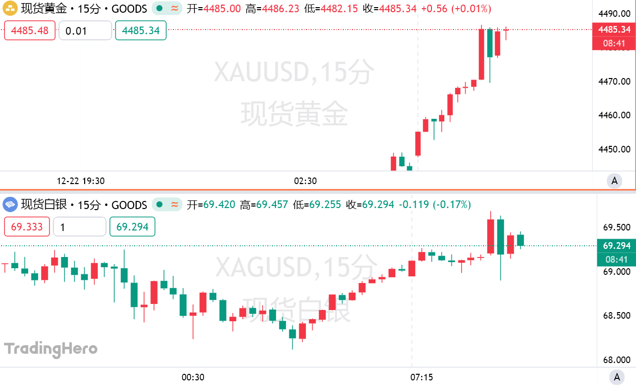 行情回顾: 国际黄金周一(12月22日)大幅收涨,开盘价4340.42美元/盎司,最高价4435.57美元/盎司,最低价4337.96美 元/盎司,收盘价4431.78美元/盎司。 消息面: 美联储理事米兰表示,随着近期货币政策调整的推进,他此前主张降息50个基点的必要性已有所减弱。米兰指 出,此前通胀数据中出现了一些异常波动,部分与政府停摆有关。这些异常信号表明,美联储政策立场应朝更 宽松的方向调整。他强调,目前并未看到经济在短期内陷入衰退的风险,但认为中性利率水平已明显下移,货 币政策必须反映这一结构性变化。若政策利率未能持续下调以贴近新的中性水平,反而可能增加经济陷入衰退 的风险。此外,对于自身任期问题,米兰坦言尚不确定是否会留任。他表示:如果到1月底仍未有继任者获得 确认,我将默认自己将继续履职。 美国银行CEO莫伊尼汉表示,人工智能正开始对美国经济产生更大影响。莫伊尼汉周一接受电视采访时表 示:"今年AI投资持续积累,明年及未来几年可能会成为更重要的增长动力。AI的影响正日益凸显,虽然不能 将所有增长归因于AI,但其边际效应已相当显著。"执掌该行近15年的莫伊尼汉称,美银预测美国明年经济将 保持强劲 ...