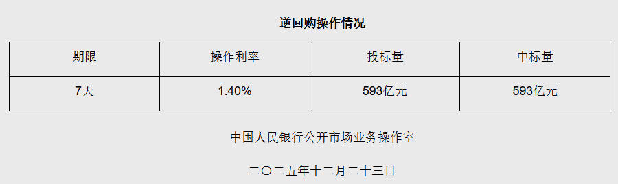 12月23日央行开展593亿元7天期逆回购操作 中新网12月23日电 据央行网站消息,2025年12月23日中国人民银行以固定利率、数量招标方式开展了593亿元7天期逆回购操 作。具体情况如下: 广告等商务合作,请点击这里 中新经纬版权所有,未经书面授权,任何单位及个人不得转载、摘编或以其它方式使用。 关注中新经纬微信公众号(微信搜索"中新经纬"或"jwview"),看更多精彩财经资讯。 图源:央行网站截图 来源:中国新闻网 编辑:郭晋嘉 本文为转载内容,授权事宜请联系原著作权人 | 期限 CONTRACTOR | 操作利率 | 投标量 | 中标量 | | --- | --- | --- | --- | | 7天 | CARDER STORES OF 1.40% | 593亿元 | 593亿元 | ...
