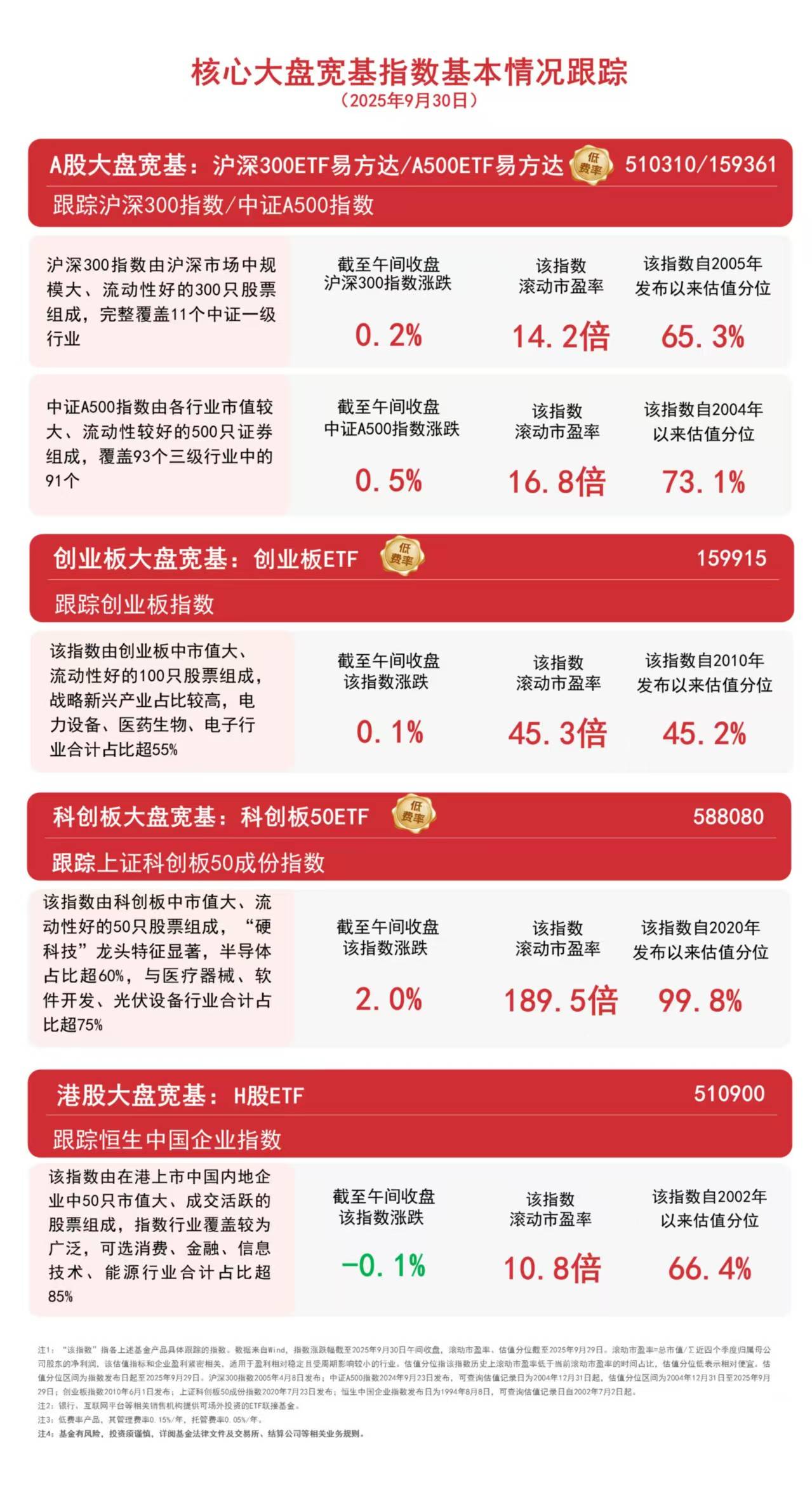 A股三大指数早盘收涨,全市场半日成交额13698亿元,较上日放量761亿元。板块题材上,半导体、能源金属、存储芯片板块走高,多元金融、保险板块调 整;港股高开后回落,半导体、有色金属、医药生物等板块涨幅居前。截至午间收盘,中证 A500指数上涨0.5%,沪深300指数上涨0.2%,创业板指数上涨 0.1%,上证科创板50成份指数上涨2.0%,恒生中国企业指数下跌0.1%。 核心大盘宽基指数基本情况跟踪 (2025年9月30日) A股大盘宽基:沪深300ETF易方达/A500ETF易方达 (A 510310 跟踪沪深300指数/中证A500指数 | 沪深300指数由沪深市场中规 | 截至午间收盘 | 该指数 | 该指数 | | --- | --- | --- | --- | | 模大、流动性好的300只股票 | 沪深300指数涨跌 | 滚动市盈率 | 发布以来 | | 组成,完整覆盖11个中证一级 行业 | 0. 2% | 14.2倍 | 65 | | 中证A500指数由各行业市值较 | 截至午间收盘 | 该指数 | 该指数 | | 大、流动性较好的500只证券 | 中证A500指数涨跌 | 滚动市盈率 | 以 ...