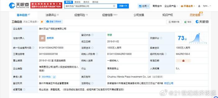 【#万达再转让1家万达广场#】天眼查App显示,近日,滁州万达广场投资有限公司发生工商变更,大 连万达商业管理集团股份有限公司退出股东行列,新增廊坊市泽瑞通科技有限公司全资持股,同时该公 司法定代表人、董事等均发生变更。 滁州万达广场投资有限公司成立于2018年1月,注册资本1000万人民币,经营范围包括物业投资、房屋 租赁。股权全景穿透图显示,该公司现由廊坊市泽瑞通科技有限公司全资持股,后者由北京泽瑞通科技 有限公司、河北廊控经济发展有限公分别持股55%、45%。 | | | 图公司 图书馆 图关系 营风险 上州万达厂老投资有限公司 | 0 天皇一下 | 品 应用 · | | 离务合作 企业级产品 - 由开圆合员 · 血 tycv -- | | | --- | --- | --- | --- | --- | --- | --- | --- | | 基本信息 47 | 法律诉讼 | 经营风险 19 | 经营值量 0659 | 公司发展 | 知识产权 | | 历史值息(1) | | 工商信息 历史工商信息> ■ ■日日■工商业网 | | | | | | 田 於黎明出 司 #월 | 心天眼堂 | | 企业各职 | ...