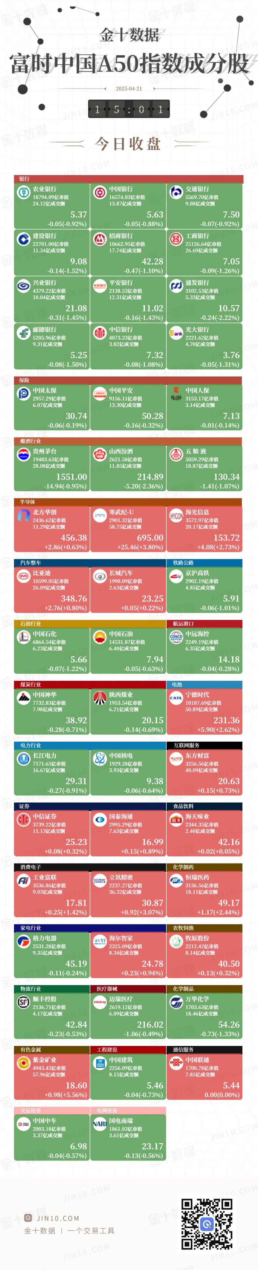 金十图示:2025年04月21日(周一)富时中国A50指数成分股今日收盘行情一览:银行、保险、酿酒板块午后延续跌势,半导体行业全天飘红