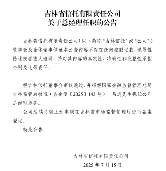 近日,吉林省信托有限责任公司(以下简称:"吉林信托")发布公告:经董事会审议及国家金融监督管 理总局吉林监管局核准(吉金复〔2025〕143号),吕进正式履职公司总经理。值得一提的是,公司近 期完成股权结构重大调整,吉林省金融控股集团股份有限公司(以下简称:"吉林金控集团")持股比例 升至62.11%,成为控股股东。这一系列变动标志着吉林信托正式迈入"省金控主导"的发展新阶段。 根据公开资料,吕进长期深耕银行系统,具备丰富的金融管理经验。其职业履历显示,自2014年12月 起,吕进先后担任光大银行长春大马路支行行长、长春分行营业部总经理,并于2019年8月升任长春分 行副行长,在机构运营、业务拓展及风险管理等领域沉淀了深厚专业能力。 值得一提的是,吉林信托近期在股权与资本层面动作频频。2025年1月,吉林信托完成增资扩股,注册 资本从31.50亿元增至42.05亿元。 然而,仅数月后,股权格局再度生变。天眼查最新工商信息显示,原股东吉林省方圆资产管理有限公司 已退出股东行列,其持有的25.09%股权(10.55亿股)悉数转让给吉林金控集团。至此,吉林金控集团 持股比例升至62.11%,实现绝对控股。市场分析认 ...