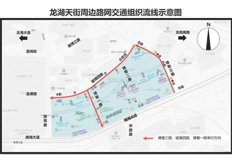 海南日报海口7月29日讯 (海南日报全媒体记者 邓海宁 通讯员 钟玲)7月29日,海南日报全媒体记者从 海口市公安局交警支队获悉,为缓解海口龙湖天街商圈周边路网交通拥堵,拟定于7月31日起至8月31日对博 巷三路(南海大道至坡博四横路段)、坡博四横路(博巷三路至豪苑路段)、博巷一路实施机动车单向交通组织调 整(试行)。 据了解,此次调整包括:博巷三路(南海大道至坡博四横路段)机动车由双向通行调整为南往北单向通 行,非机动车保持双向通行;坡博四横路(博巷三路至豪苑路段)机动车由双向通行调整为东往西单向通行,非 机动车保持双向通行;博巷一路机动车由双向通行调整为北往南单向通行,非机动车保持双向通行。 海口交警表示,请机动车驾驶人途经博巷三路(南海大道至坡博四横路段)、坡博四横路(博巷三路至豪苑 路段)、博巷一路时,自觉按照交通标志、交通标线的指示通行。 龙湖天街周边路网交通组织流线示意图。受访者供图 ...