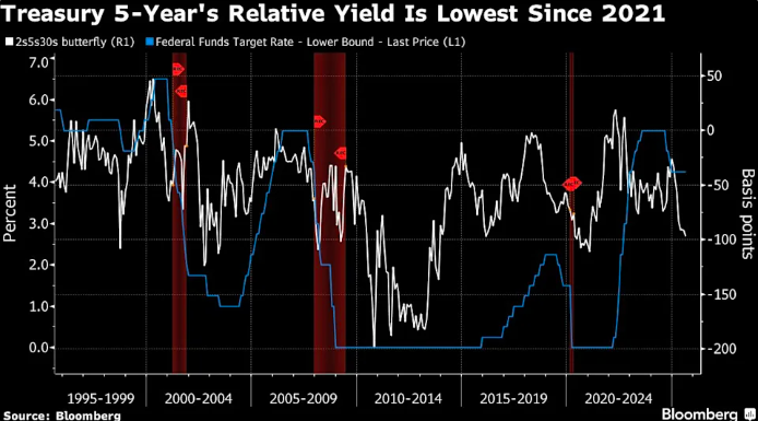 过去几周,美联储主席鲍威尔持续面临来自特朗普政府的施压,要求美联储大幅降息至1%水平。而尽 管美联储目前依然迟迟按兵不动,但美债市场上的一些迹象却显示,在特朗普第二任期内,美联储大幅 降息或许绝非是一幕难以想象的场景…… 他们的比较对象是2年期和30年期国债收益率。在该称为"蝶式价差"策略的计算中,5年期收益率被乘以 两倍,再减去两年期和30年期收益率之和。目前这一计算结果为接近-100个基点,处于自2021年初以来 的区间低端。 高盛利率策略师在最新的报告中就发现,5年期美债相比起其他期限的国债而言,在历史上很少像现在 这样昂贵——只有美联储降息至零的那些时期例外。 周三,5年期国债收益率报约3.78%,仍处于自2022年初以来的高位区间。不过,债券市场中常见的相 对价值计算方法——即通过将收益率与较短和较长期限的债券收益率进行比较来评估显示,五年期美债 的估值目前正处于历史高位。 高盛策略师William Marshall和Bill Zu在周二发布的一份报告中写道,"美国国债市场当前的一个显著 特征是5年期国债的高估状态。" 不过,高盛团队认为这种情况不太可能持续下去。 基于对美联储降息的预期,五年期美债 ...