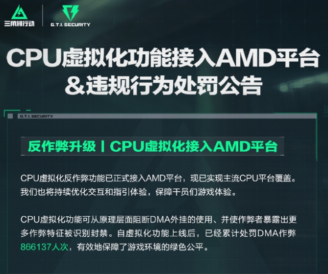 反作弊技术升级 - CPU虚拟化反作弊功能成功接入AMD平台 实现对主流CPU平台的全面覆盖 [1] - 该功能于7月11日率先在Intel平台上线 从原理层面阻断DMA作弊工具使用 [3] - 功能主要针对异常登录环境或安全风险账号 通过要求开启虚拟化功能防止账号被利用 [3] - 累计处罚DMA作弊行为866,137人次 有效遏制作弊现象 [3] 游戏市场表现 - 游戏于2024年9月26日上线后立即登上iOS免费榜第一 [4] - 抖音快手总榜全天在榜 多个衍生话题登上热搜 最高达快手总榜TOP1和知乎热榜第三 [4] - 截至10月4日全网注册用户突破2500万 [4] - 12月提名2024年度游戏十强榜优秀客户端游戏 [4] 产品背景信息 - 游戏由腾讯天美工作室群琳琅天上团队研发 腾讯游戏发行 [3] - 为多平台跨端第一人称特战干员战术射击游戏 吴彦祖担任品牌代言人 [3] - 2023年7月24日通过国产网络审批 2024年9月26日正式上线 [3] - 运行平台包括PC、主机和手机 2025年2月21日上线全新战役模式"黑鹰坠落" [3]