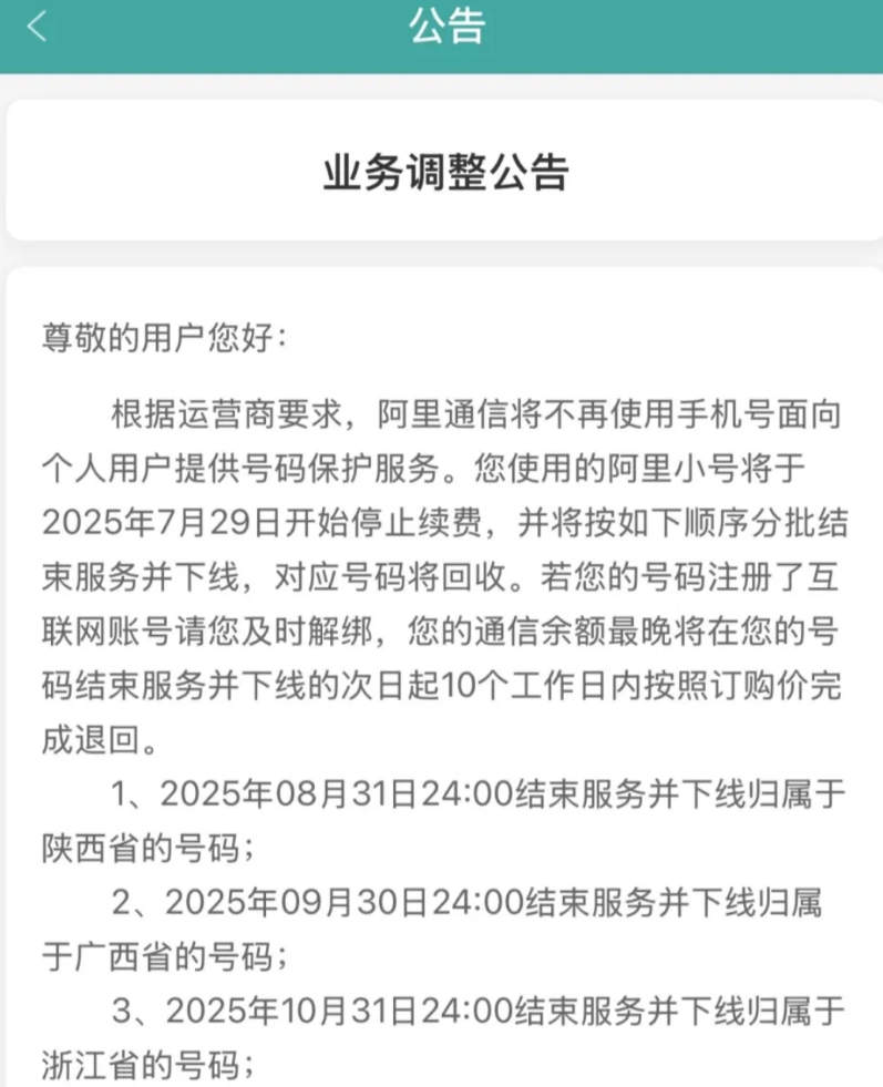 7月29日,阿里小号App发布通知,宣布于7月29日停止续费服务,并计划于10月31日正式下架。这一消息在用户 群体中引发广泛关注,不少长期使用该应用的用户表示惊讶与不舍。 1.2025年08月31日24时结束服务并下线归属于陕西省的号码; 2.2025年09月30日24时结束服务并下线归属于广西省的号码; 3.2025年10月31日24时结束服务并下线归属于浙江省的号码; 4.2025年10月31日24时下架阿里小号APP。 今年4月23日,阿里通信曾向用户发布公告,因运营商政策调整,阿里小号服务将于2025年4月29日24时正式终止 运营,所有小号将被回收,未使用余额自动退回。据网友反映,4月份下线的是部分号段,受影响的用户需要对 自己绑定的各种账号更新手机号码。 公告显示,用户使用的阿里小号将于2025年7月29日开始停止续费,并将按如下顺序分批结束服务并下线,对应 号码将回收。若用户号码注册了互联网账号请及时解绑,通信余额最晚将在号码结束服务并下线的次日起10个工 作日内按照订购价完成退回。 ...
