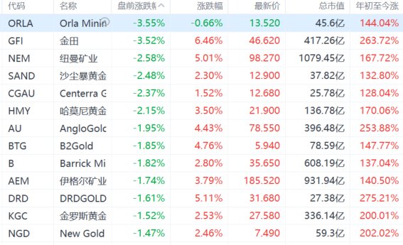 | 代码 | 名称 | 盘前涨跌 ^ | 涨跌幅 | 最新价 | 总市值 | 年初至今涨 | | --- | --- | --- | --- | --- | --- | --- | | ORLA | Orla Minin | -3.55% | -0.66% | 13.520 | 45.6/Z | 144.04% | | GFI | 等出 | -3.52% | 6.46% | 46.620 | 417.26 Z | 263.72% | | NEM | 纽曼矿业 | -2.58% | 5.01% | 98.270 | 1079.45 Z | 167.72% | | SAND | 沙尘暴黄金 | -2.48% | 2.30% | 12.900 | 37.82 Z | 132.80% | | CGAU | Centerra G | -2.37% | 1.52% | 12.680 | 25.78亿 | 128.04% | | HIMY | 哈莫尼黄金 | -2.15% | 3.50% | 21.900 | 136.78亿 | 170.06% | | AU | AngloGolc | -1.95% | 4.43% | 7 ...