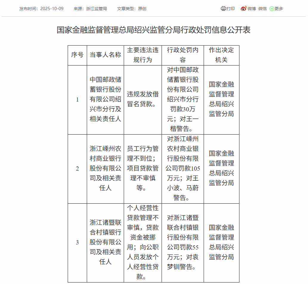 新华财经北京10月9日电 因违规发放借冒名贷款等,绍兴三家银行合计被罚190万元。 | 序号 | 当事人名称 | 主要违法违 | 行政处罚内 | 作出决定 | | --- | --- | --- | --- | --- | | | | 规行为 | 容 | 机关 | | 1 | 中国邮政储 蓄银行股份 | 冒名贷款。 | 对中国邮政 储蓄银行股 份有限公司 | 总局绍兴 | | | | | | 国家金融 | | | | 违规发放借 | | 监督管理 | | | 有限公司绍 | | 绍兴市分行 | | | | 兴市分行及 | | 罚款30万 | 监管分局 | | | 相关责任人 | | 元;对于一 | | | | | | 楷警告。 | | | 2 | 浙江嵊州农 村商业银行 | 员工行为管 理不到位; | 对浙江嵊州 农村商业银 行股份有限 | | | | | | | 国家金融 | | | | | | 监督管理 | | | 股份有限公 | 项目贷款管 | 公司罚款105 | | | | 司及相关责 | 理不审慎 | | 总局绍兴 | | | | | 万元;对王 | 监管分局 | | | 任人 | 等。 | 小波、 ...
