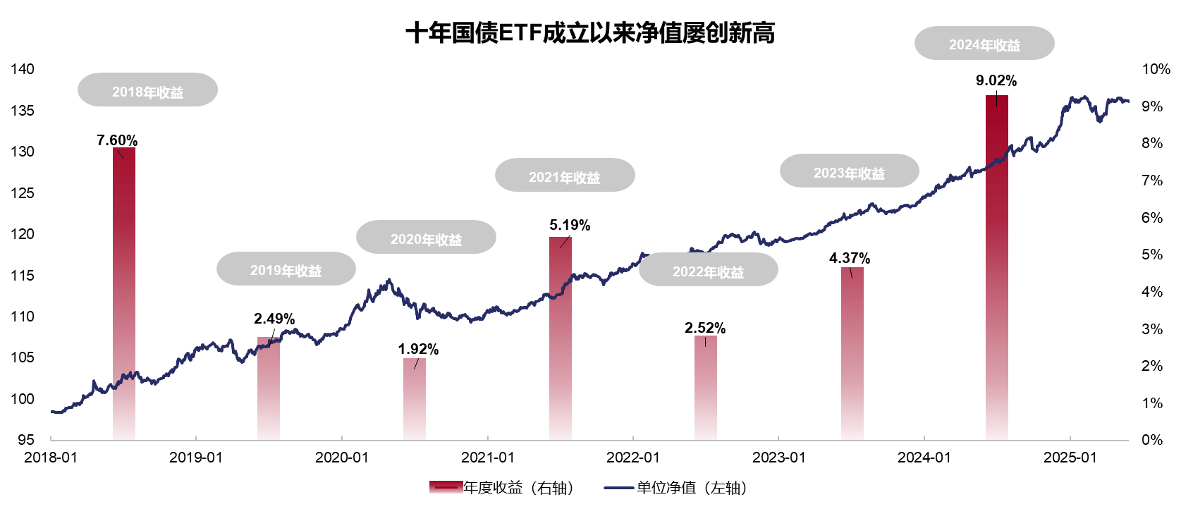 2025年以来,定期存款利率持续下跌,如何获得更为稳健而又有竞争力的收益已成为2025年投资者最迫切的焦虑,债券市场再度成为投资者的热门选择。根 据Wind数据,债券型ETF从年初的1740亿元增至3800多亿元。其中,债市压舱石——十年国债ETF(511260)净流入额近百亿元,当前规模近150亿元,流 动性占优。 从过往表现来看,十年国债ETF(511260)成立以来净值屡创新高,历史业绩持续稳健。根据基金定期报告,截至一季度末,近1年回报率达6.02%,近3年 回报率达15.04%,近5年回报率达19.26%,成立至今累计回报率达34.63%。 值得关注的是,十年国债ETF成立以来经历了2018~2024年共计7个完整自然年度,均保持每年正收益,有望成为穿越牛熊周期的资产配置利器。 此外,十年国债ETF还有四点独特的配置优势: 1、T+0交易便捷:国债类ETF实行"T+0"交易,即当日买入、当日可卖出。低利率环境中,市场呈现高波动行情,高波动中必然蕴含较多的波段交易机会。 从宏观环境来看,国内需求疲软态势延续,消费与地产投资复苏缓慢,企业资本开支意愿低迷,推动资金持续流入债市。另外,中美经济周期错位缓解 ...