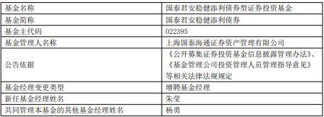 中国经济网北京8月27日讯 今日,上海国泰海通证券资产管理有限公司公告,国泰君安稳健添利债券增 聘朱莹。 国泰君安稳健添利债券A/C成立于2024年12月24日,截至2025年8月26日,其今年来收益率为1.56%、 1.36%,成立来收益率为1.58%、1.37%,累计净值为1.0158元、1.0137元。 朱莹历任上海东证期货衍生品研究院高级金融工程分析师;2020年9月加入上海国泰君安证券资产管理 有限公司,历任固定收益部研究员、投资经理助理、固定收益投资部(公募)基金经理,现任公司多资 产策略投资部(公募组)基金经理,主要从事债券投资研究工作。 | 基金名称 | 因泰君安稳健添利债券型证券投资基金 | | --- | --- | | 基金简称 | 因秦君安稳健添利债券 | | 基金主代码 | 022395 | | 基金管理人名称 | 上海国泰海通证券资产管理有限公司 | | 公告依据 | 《公开募集证券投资基金信息披露管理办法》、 《基金管理公司投资管理人员管理指导意见》 | | | 等相关法律法规规定 | | 基金经理变更类型 | 增聘基金经理 | | 新任基金经理姓名 | 朱莹 | | 共同管理本 ...