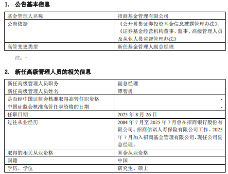 | 基金管理人名称 | 招商基金管理有限公司 | | --- | --- | | 公告依据 | 《公开募集证券投资基金信息披露管理办法》、 | | | 《证券基金经营机构董事、监事、高级管理人员 | | | 及从业人员监督管理办法》 | | 高管变更类型 | 新任基金管理人副总经理 | 中国经济网北京8月26日讯今日,招商基金公告,任命谭智勇为副总经理。 谭智勇2004年7月至2025年7月曾在招商银行(600036)股份有限公司、招商信诺人寿保险有限公司工 作。2025年7月加入招商基金管理有限公司,现任公司副总经理。 | 新任高级管理人员职务 | 副总经理 | | --- | --- | | 新任高级管理人员姓名 | 调智勇 | | 是否经中国证监会核准取得高管任职资格 | | | 中国证监会核准高管任职资格的日期 | | | 任职日期 | 2025年8月26日 | | 过往从业经历 | 2004年7月至2025年7月曾在招商银行股份有 | | | 限公司、招商信诺人寿保险有限公司工作。2025 | | | 年7月加入招商基金管理有限公司,现任公司副 | | | 总经理。 | | 取得的相关从业资格 | ...