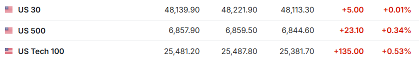 1. 12月22日(周一)美股盘前,美股三大股指期货齐涨。截至发稿,道指期货涨0.01%,标普500指数期货涨0.34%,纳指 期货涨0.53%。 | ■ US 30 | 48,139.90 | 48,221.90 | 48,113.30 | +5.00 | +0.01% | | --- | --- | --- | --- | --- | --- | | = US 500 | 6,857.90 | 6,859.50 | 6,844.60 | +23.10 | +0.34% | | 트 US Tech 100 | 25,481.20 | 25,487.80 | 25,381.70 | +135.00 | +0.53% | 2. 截至发稿,德国DAX指数跌0.01%,英国富时100指数跌0.42%,法国CAC40指数跌0.33%,欧洲斯托克50指数跌 0.11%。 | 德国DAX30 | 24,294.48 | 24,366.33 | 24,263.97 | -1.47 | -0.01% | | --- | --- | --- | --- | --- | --- | | 类 英国富时100 | 9,856.32 ...