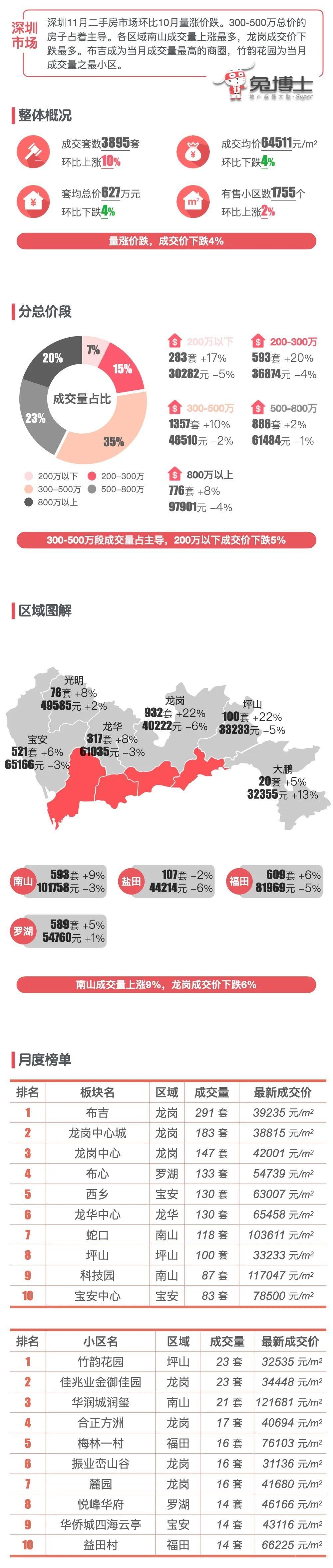 深圳SHENZHEN 下个月开始我们会做年度楼市总结,我们会把2025年新房、二手房、二手挂牌的年度榜单都发布出来,还有专业的年度报告。大家有兴趣的话 记得关注兔博士。 这一篇呢是二手房楼市数据篇。我们之前就说过金九银十的神话早就破灭了。再加上下面的数据,大家看一看应该心里更清楚了! 数据说明Explain:数据出自兔博士app,2025年11月二手房成交数据,环比2025年10月。 300-500万段成交量占主导,200万以下成交价下跌5% 区域名字 35% 200-300万 ● 200万以下 500-800万 300-500万 800万以上 46510元 -2% 61484元 -1% ($ 800万以上 776套 +8% 97901元 -4% 光明 18套 +8% 龙岗 t本川 49585元 +2% 932套 +22% 100套 +22% 40222元 -6% 龙华 33233元-5% 317套 +8% 宝安 好套 +6% 61035元 -3% 65166元 -3% 大鹏 20套 +5% 32355元 +13% 593套 +9% 107套-2% 609套 +6% 盐田 南山 福田 101758元 -3% ...