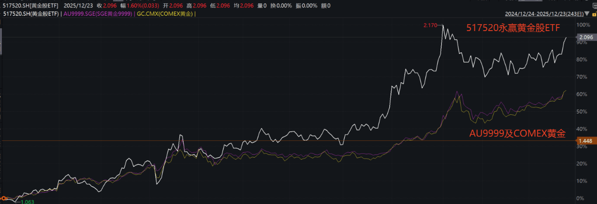 | 代码 | 名称 | 现价 | 涨跌 涨跌幅 ▼ | | | --- | --- | --- | --- | --- | | 159322 | 黄金股票ETF基金 | 1.711 | 0.039 2.33% | | | 159321 | 黄金股票ETF | 1.614 | 0.036 | 2.28% | | 517520 | 黄金股ETF | 2.110 | 0.047 | 2.28% | | 159562 | 黄金股ETF | 2.304 | 0.051 | 2.26% | | 159315 | 黄金股ETF基金 | 1.723 | 0.037 | 2.19% | | 517400 | 黄金股票ETF | 1.661 | 0.034 | 2.09% | 有分析认为,全球央行持续购金已成为打破传统供需平衡的关键变量,而美联储货币政策转向宽松预计将进一步 利好黄金。长期来看,美元购买力变化、央行储备行为及地缘政治风险仍是影响金价的核心因素。 黄金概念股早盘走强,山东黄金涨超6%,招金矿业涨超3%,中金黄金、赤峰黄金、山金国际涨超2%。 受盘面影响,黄金股相关ETF涨超2%。 (文章来源:每日经济新闻) ...