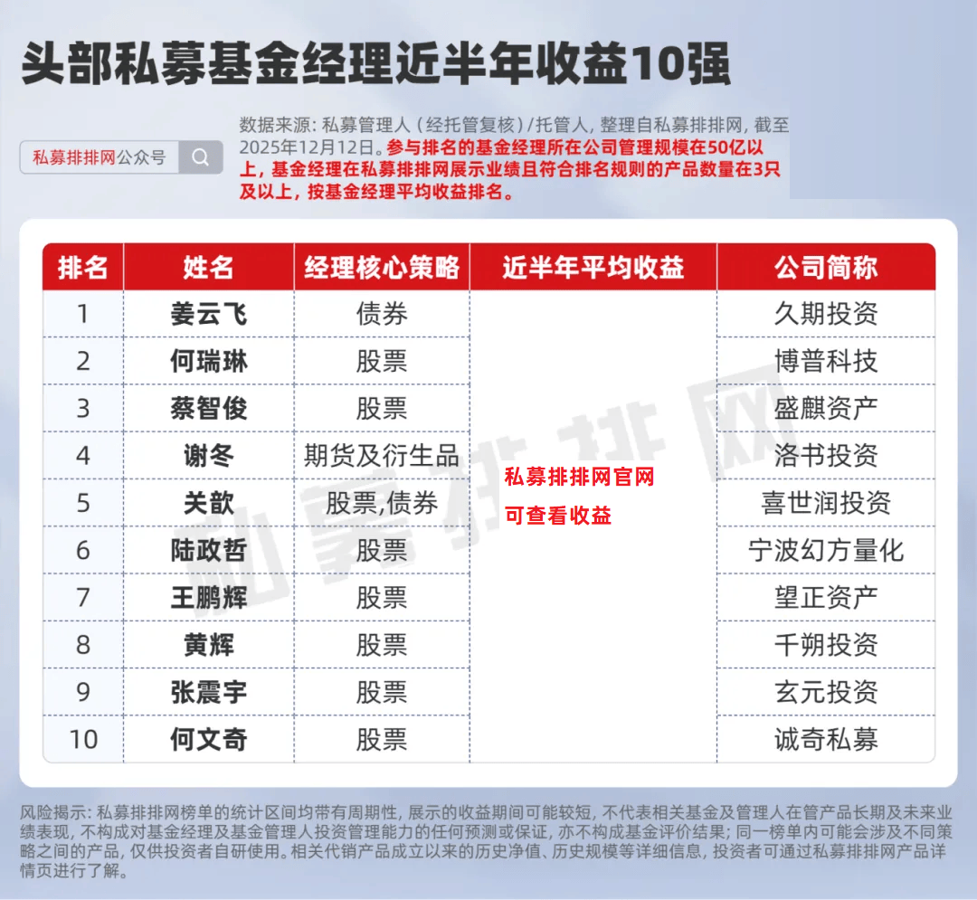 头部私募往往管理50亿甚至上百亿资金,相对于规模较小的私募对市场掌握了更高的"定价权",而其背后的基金经理的一举一动更是备受市场关注。私募 排排网数据显示,截至2025年12月12日,头部私募的基金经理共有1280位,仅占所有基金经理总数的4.21%。 从业绩层面来看,所管的产品至少有3只近半年、1年、3年、5年符合排名规则的头部私募基金经理分别有135位、126位、82位、41位,平均收益分别为 16.6%、27.06%、53.97%、89.5%。那么,究竟有哪些私募基金经理近半年、1年、3年、5年业绩位居前列呢? [应监管要求,私募产品不能公开展示业绩,文中涉及收益数据用***替代。] | 排名 | 姓名 | 经理核心策略 | 近半年平均收益 | 公司简称 | | --- | --- | --- | --- | --- | | 7 | 姜云飞 | 债券 | | 久期投资 | | 2 | 何瑞琳 | 股票 | | 博普科技 | | 3 | 蔡智俊 | 股票 | | 盛麒资产 | | ব | 谢冬 | 期货及衍生品 | 私募排排网官网 | 洛书投资 | | 5 | 关歆 | 股票,债券 | 可查看收益 | 喜 ...