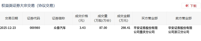 | 交易日期 | 证券代码 | 证券简称 | 成交价格 | 成交量 | 成交金额 | 买方营业部 | 卖方营业部 | | --- | --- | --- | --- | --- | --- | --- | --- | | | | | (元) | (万股/万份) | (万元) | | | | 2025-12-23 | 000980 | 众泰汽车 | 3.43 | 87.00 | | 298.41 平安证券股份有限 | 华安证券股份有限 | | | | | | | | 公司重庆分公司 | 公司浙江分公司 | 12月23日,众泰汽车大宗交易成交87万股,成交额298.41万元,占当日总成交额的0.3%,成交价3.43 元,较市场收盘价3.83元折价10.44%。 ...