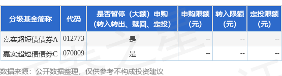 证券之星消息,9月26日嘉实基金管理有限公司发布《关于嘉实超短债证券投资基金2025年国庆节、中 秋节前暂停申购(含转换转入及定期定额投资)业务的公告》。公告中提示,为了保证基金的平稳运 作,保护基金份额持有人利益,自2025年9月30日起嘉实超短债证券投资基金2025年国庆节、中秋节前 暂停申购(含转换转入及定期定额投资)业务,下属分级基金调整明细如下: 以上内容为证券之星据公开信息整理,由AI算法生成(网信算备310104345710301240019号),不构成 投资建议。 | 分级基金简称 | 代码 | 是否暂停(大额)申购 | 申购限额 转入限额 定投限额 | | --- | --- | --- | --- | | | | (转入转出、赎回、定投) | (元) (元) (元) | | 嘉实招短债债券A | 012773 | 분 | | | 嘉实超短信债券C | 070009 | 분 | | ...