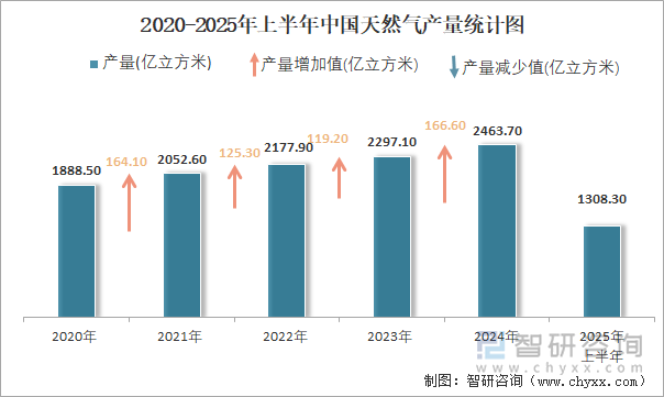 2025年上半年中国天然气产量为1308.3亿立方米 累计增长5.8%