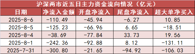 A股市场整体表现 - 上证指数收报3633.99点,上涨0.45%,深证成指收报11177.78点,上涨0.64%,创业板指收报2358.95点,上涨0.66%,北证50指数上涨1.58% [1] - A股市场合计成交17595.36亿元,较上一交易日增加1434.8亿元 [1] 主力资金流向 - A股市场全天主力资金净流出110.49亿元,开盘净流出45.94亿元,尾盘净流出6.27亿元 [2] - 沪深300主力资金净流出23.6亿元,创业板净流出19.36亿元,科创板净流出21.98亿元 [4] - 近五日主力资金净流出趋势:8月6日-110.49亿元,8月5日-125.23亿元,8月4日-38.69亿元,8月1日-242.36亿元,7月31日-300.80亿元 [3] 行业资金流向 - 申万一级行业中16个行业实现资金净流入,国防军工行业净流入98.47亿元居首,涨幅2.97% [6] - 资金净流入前五行业:电子(78.44亿元)、机械设备(73.93亿元)、计算机(71.84亿元)、电力设备(38.24亿元) [7] - 资金净流出前五行业:医药生物(-191.24亿元)、建筑装饰(-27.53亿元)、公用事业(-20.98亿元)、银行(-18.27亿元)、社会服务(-18.24亿元) [7] 龙虎榜机构动向 - 机构净买入个股:铜陵有色(10060.06万元)、诚意药业(8838.78万元)、炬光科技(7529.53万元) [10] - 机构净卖出个股:西部材料(-10682.34万元)、新恒汇(-9339.09万元)、东杰智能(-6166.42万元) [10] 机构最新关注个股 - 九洲药业目标价29.12元,最新收盘价18.46元,上涨空间57.75% [11] - 比亚迪目标价149.00元,最新收盘价104.35元,上涨空间42.79% [11] - 宇通客车目标价38.00元,最新收盘价25.65元,上涨空间48.15% [11]