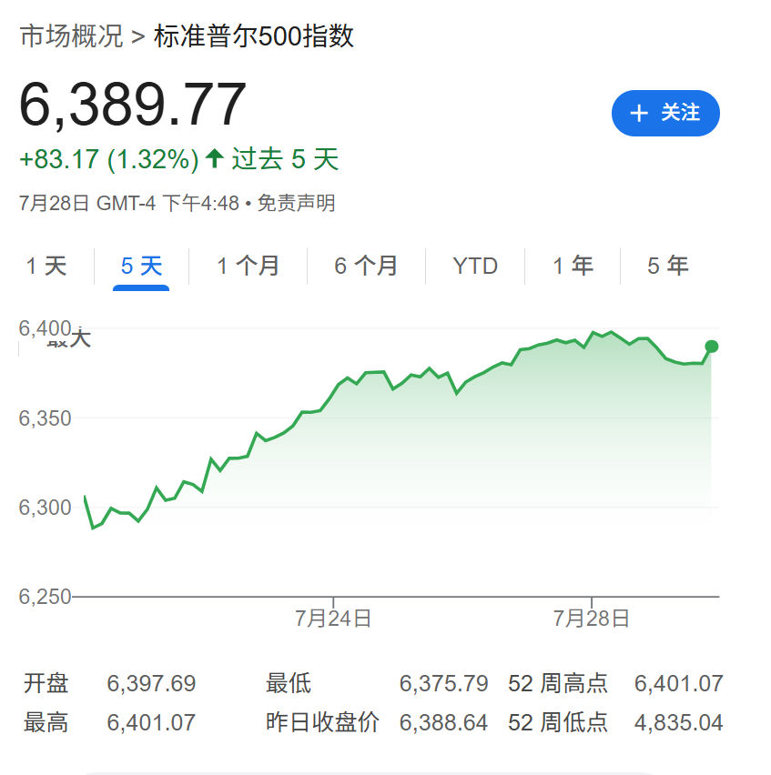 1. 7月29日(周二)美股盘前,美股三大股指期货齐涨。截至发稿,道指期货涨0.13%,标普500指数期货涨0.30%,纳指期货涨0.47%。 | ■ US 30 | 44,896.50 | 44,950.00 | 44,793.00 | +58.90 | +0.13% | | --- | --- | --- | --- | --- | --- | | ■ US 500 | 6,409.10 | 6,409.60 | 6,391.10 | +19.30 | +0.30% | | 틀 US Tech 100 | 23,466.30 | 23,469.40 | 23,366.40 | +110.00 | +0.47% | 2. 截至发稿,德国DAX指数涨1.17%,英国富时100指数涨0.55%,法国CAC40指数涨1.10%,欧洲斯托克50指数涨1.02%。 | 德國DAX30 | 24,223.47 | 24,309.91 | 24,027.94 | +278.96 | +1.17% | | --- | --- | --- | --- | --- | --- | | * 英國富時100 | 9,131.52 ...
