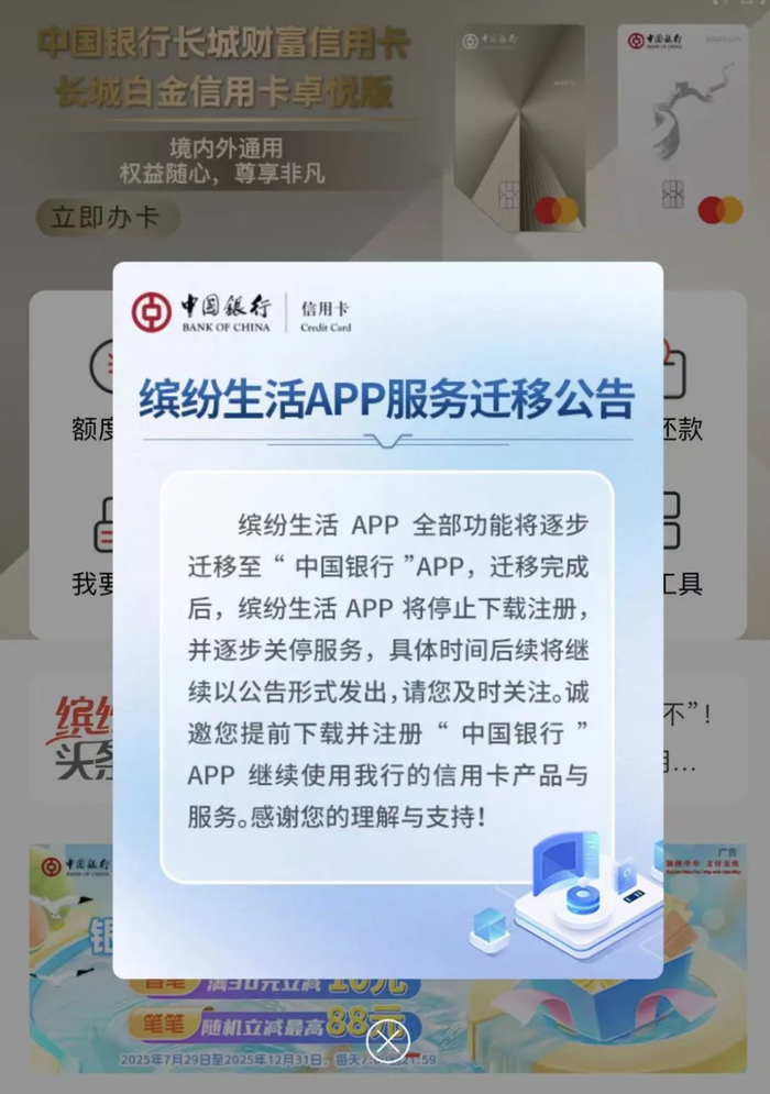 除了信用卡类App,还有部分直销银行App也陆续关停。10月10日,北京银行公告称,因直销银行业务 调整,其直销银行App、直销银行网站将于2025年11月12日起停止服务,原直销银行相关业务已迁移至 北京银行"京彩生活"手机银行。 苹果手机应用商城显示,"缤纷生活"App是中国银行信用卡官方客户端,提供信用卡基础功能服务、移 动支付服务、积分及分期商城、商户优惠、活动资讯等内容。截至发稿时,"缤纷生活"App仍能在应用 商城下载。在打开该App后,会弹窗显示前述迁移公告。公告指出,迁移完成后,"缤纷生活"App将停 止下载注册,并逐步关停服务。 【#多家银行关停旗下App# 啥原因[思考]?】有用户可能会发现,一家银行除了有综合类的手机App, 可能还有信用卡App、支付类App、生活服务类App。这种情况正在发生改变。近日,中国银行信用卡 微信公众号发布公告称,该行现已启动"缤纷生活"App服务迁移,"缤纷生活"App全部功能将逐步迁移 至"中国银行"App。中新经纬梳理发现,今年以来,已有10余家银行关停了旗下部分手机App,主要涉 及信用卡App、直销银行App、生活类App等。为何银行要关停这些Ap ...