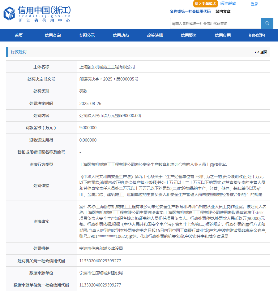 近日,信用浙江公示了上海颐东机械施工工程有限公司的行政处罚决定。处罚决定书文号甬建罚决字﹝2025﹞第000005号显 示,上海颐东机械施工工程有限公司使用未取得建筑施工企业项目负责人安全生产知识考核合格证书的人员担任项目负责人。 根据《中华人民共和国安全生产法》第九十七条第(二)项的规定,宁波市住房和城乡建设局对其罚款9万元。 | | 进入老年模式 阅读辅助 盟录 | | --- | --- | | | 名称或统一社会信用代码 站内文章 | | | Q 请输入名称或统一社会信用代码查询 | | 首页 信用查询 | 专题公示 信用动态 政策法规 信用服务 信用应用 組织指构 | | 行政处罚 | << 返回 | | 主体名称 | 上海颐东机械施工工程有限公司 | | 处罚决定书文号 | 角建罚决字(2025)第000005号 | | 处罚类别 | 罚款 | | 处罚决定时间 | 2025-08-26 | | 处罚内容 | 处罚款人民币玖万元整(¥90000.00) | | 罚款金额(万元) | 9.000000 | | 没收违法所得 | 0.000000 | | 暂扣或吊销证照名称及编号 | - | | 违法 ...