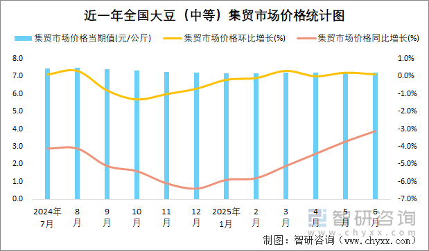 2025年6月全国大豆(中等)集贸市场价格当期值7.22元/公斤,同比下滑3.1%
