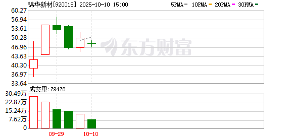 具体来看,今日上榜营业部中,第一大买入营业部为东方财富证券股份有限公司拉萨团结路第二证券营 业部,买入金额为1097.87万元,第一大卖出营业部为广发证券股份有限公司临沂孝河路营业部,卖出 金额为1367.07万元。 锦华新材(920015)今日下跌4.49%,全天换手率25.61%,成交额3.80亿元,振幅5.61%。龙虎榜数据显 示,营业部席位合计净卖出1539.45万元。 北交所公开信息显示,当日该股因日换手率达25.61%上榜,营业部席位合计净卖出1539.45万元。 证券时报·数据宝统计显示,上榜的前五大买卖营业部合计成交1.12亿元,其中,买入成交额为4818.17 万元,卖出成交额为6357.62万元,合计净卖出1539.45万元。 近半年该股累计上榜龙虎榜5次,上榜次日股价平均跌3.02%,上榜后5日平均跌5.72%。(数据宝) 锦华新材10月10日交易公开信息 (文章来源:证券时报网) | 买/ 卖 | 会员营业部名称 | 买入金额(万元) | 卖出金额(万元) | | --- | --- | --- | --- | | 买一 | 东方财富证券股份有限公司拉萨团结路第二证券营业 | 1097 ...