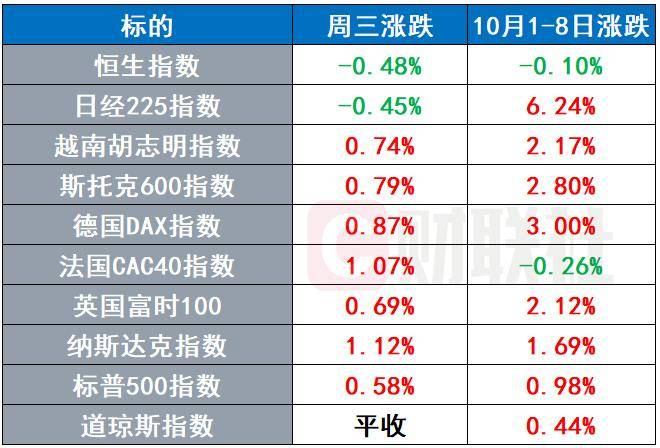 智通财经10月9日讯(编辑 史正丞)昨夜今晨,随着英伟达CEO黄仁勋的发声,科技股上涨浪潮推动 标普500指数、纳斯达克指数再创历史新高。 早些时候因法国政治僵局出现进展,欧洲股指普遍走高,斯托克600指数、德国DAX指数、英国富时100指数均创历史新高。越南基准股指也在升入富时罗 素新兴市场指数的利好带动下创出历史新高。本周早些时候,日经225指数也在主张财政宽松的高市早苗有望出任新首相影响下创出新高。 | 标的 | 周三涨跌 | 10月1-8日涨跌 | | --- | --- | --- | | 恒生指数 | -0. 48% | -0. 10% | | 日经225指数 | -0. 45% | 6.24% | | 越南胡志明指数 | 0. 74% | 2. 17% | | 斯托克600指数 | 0. 79% | 2. 80% | | 德国DAX指数 | 0. 87% | 3.00% | | 法国CAC40指数 | 1.07% | -0. 26% | | 英国富时100 | 0. 69% | 2. 12% | | 纳斯达克指数 | 1.12% | 1. 69% | | 标普500指数 | 0. 58% | 0 ...