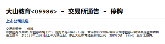 监管行动与交易状态 - 香港证监会指示联交所自2025年12月3日上午9时起暂停大山教育股份交易[1] - 暂停交易旨在维持市场公平有序并保障投资大众利益[3] - 公司于2023年3月30日曾因前任核数师发现审计问题而停牌 并于2024年9月恢复买卖[4] 涉嫌财务造假的具体指控 - 香港证监会发现公司提供的银行结单与监管独立取得的结单存在重大差异 遗漏了若干回流到公司的循环资金流记录[5] - 公司截至2023年6月30日及2023年12月31日的财务报表中 银行结余分别被严重夸大人民币3640万元及人民币7630万元[5] - 夸大的金额分别相当于其已公布财务业绩所载资产净值的19%及55%[5] - 香港证监会怀疑相关软件开发及英国收购事项并非真实交易或未按公平原则进行[5] - 公司涉嫌向证监会呈交伪造的银行结单以隐瞒可疑资金流[5] - 公司管理层诚信、内部监控和会计制度可靠性及向市场提供恰当信息的能力受到质疑[5] - 香港证监会怀疑公司2024年9月的复牌是基于其提供的虚假或具误导性资料[5] 公司历史审计问题与调查 - 前任核数师曾对供应商付款的商业实质、培训咨询服务有效性、集团贷款商业实质及英国公司收购事项提出关注[6] - 公司曾委任独立风险咨询及会计师事务所进行调查 调查结果显示一切正常[6] - 香港证监会认为公司此前发布的调查报告存在问题 且未能就监管关注事项提供使人信服的解释[7] 公司近期经营与财务状况 - 公司主要提供课外个人素质课程、海外教育咨询及多元化咨询服务[10] - 自2021年至今 公司业绩总体疲软并一直处于亏损状态[10] - 2025年中期报告显示 集团收益约为人民币4150万元 较上年同期减少约人民币600万元[10] - 报告期内集团录得亏损约人民币4590万元 上年同期亏损为880万元[10] - 截至2025年6月30日 公司银行结余及现金约为人民币1930万元 较2024年底的约人民币5200万元减少约62.9%[10] 公司股价表现 - 2024年11月 公司股价一度冲高至4.28港元/股[8] - 2025年7月 股价一度跌至1.14港元/股[8] - 2025年8月至9月 公司股价一度暴涨超100% 最高至2.95港元/股 随后再次下跌[8]