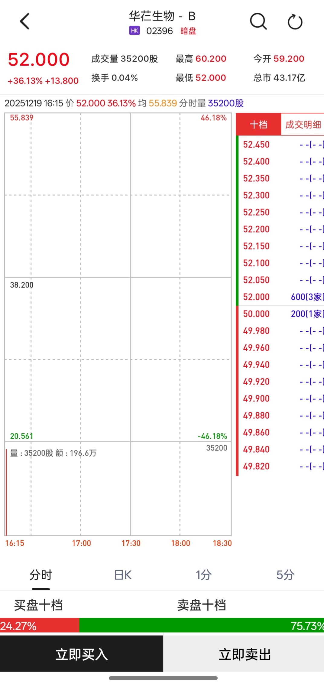 华芢生物-B(02396)将于12月22日(周一)在香港挂牌。截至发稿,利弗莫尔证券暗盘交易显示报价52.0港元,较招股价38.20港元上涨36.13%,每手200股, 不计手续费,每手赚2760港元。 | 55.839 | 46.18% | | | | --- | --- | --- | --- | | | | 十档 | 成交明细 | | | | 52.450 | - - (- - ) | | | | 52.400 | - - (- - ) | | | | 52.350 | - - (- - ) | | | | 52.300 | - - (- - ) | | | | 52.250 | - - (- - ) | | | | 52.200 | - - (- - ) | | | | 52.150 | - - (- - - ) | | | | 52.100 | - - (- - ) | | 38.200 | | 52.050 | - - (- - ) | | | | 52.000 | 600(3家) | | | | 50.000 | 200(1家) | | | | 49.980 | - - (- - ) | | | ...