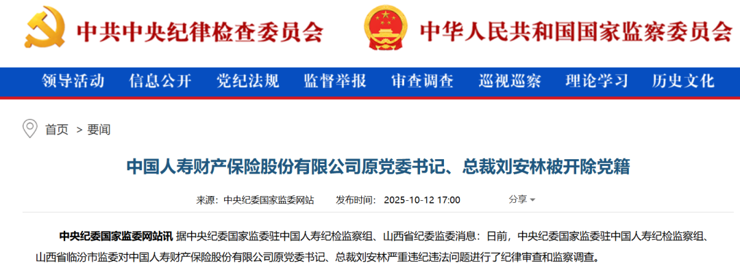 10月12日,中央纪委国家监委官网通报:中国人寿财产保险股份有限公司原党委书记、总裁刘安林被开除党籍。 值得关注的是,刘安林于2024年3月通报被查,距今已一年半有余。 据中央纪委国家监委驻中国人寿纪检监察组、山西省纪委监委消息:日前,中央纪委国家监委驻中国人寿纪检监察组、山西省临汾市监委对中国人寿财产 保险股份有限公司原党委书记、总裁刘安林严重违纪违法问题进行了纪律审查和监察调查。 经查,刘安林存在以下问题: ● 身为国有金融企业党员领导干部,丧失理想信念,背弃初心使命,政治意识淡漠,落实党中央重大决策部署不力,违规经营造成重大损失,履行全面从 严治党主体责任不力,政绩观不正,严重破坏所在单位政治生态; ● 无视中央八项规定精神,长期、多次违规收受他人赠送礼品,违规使用公务用车,接受可能影响公正执行公务的宴请;违反组织原则,多次违规提拔干 部,利用职权或者职务上的影响为多名亲友入职提供帮助; ● 廉洁底线失守,违规持有非上市公司股份,私自占用公物,违规发放奖金,大量挥霍浪费公司财产;工作严重不负责任,对委托投资项目不履行职责, 造成严重后果;生活腐化堕落,影响公职人员形象;破坏社会主义市场经济秩序,违规购买 ...