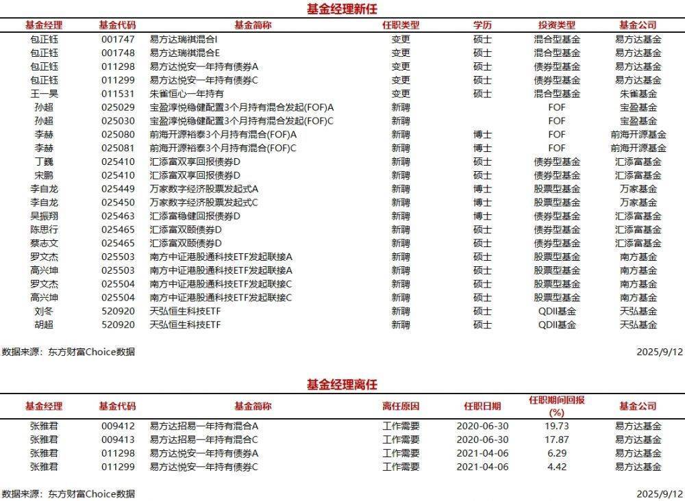 每经AI快讯,据东方财富Choice数据统计,今日新聘基金经理14人,涉及17只基金(A/C类分开计算),主要来自易方达基金、汇添富基金等 公司。另外,今日有1位基金经理离任。 | 基金经理 | 基金代码 | 基金简称 | 离任原因 | 任职日期 | 任职期间回报 | 基金公司 | | --- | --- | --- | --- | --- | --- | --- | | | | | | | (%) | | | 张雅君 | | 009412 易方达招易一年持有混合A | 工作需要 | 2020-06-30 | 19.73 | 易方达基金 | | 张雅君 | | 009413 易方达招易-年持有混合C | 工作需要 | 2020-06-30 | 17.87 | 易方达基金 | | 张雅君 | 011298 | 易方达悦安一年持有债券A | 工作需要 | 2021-04-06 | 6.29 | 易方达基金 | | 张雅君 | 011299 | 易方达悦安一年持有债券C | 工作需要 | 2021-04-06 | 4.42 | 易方达基金 | | | | | 三十六年四月十八日 | | | | | --- | -- ...