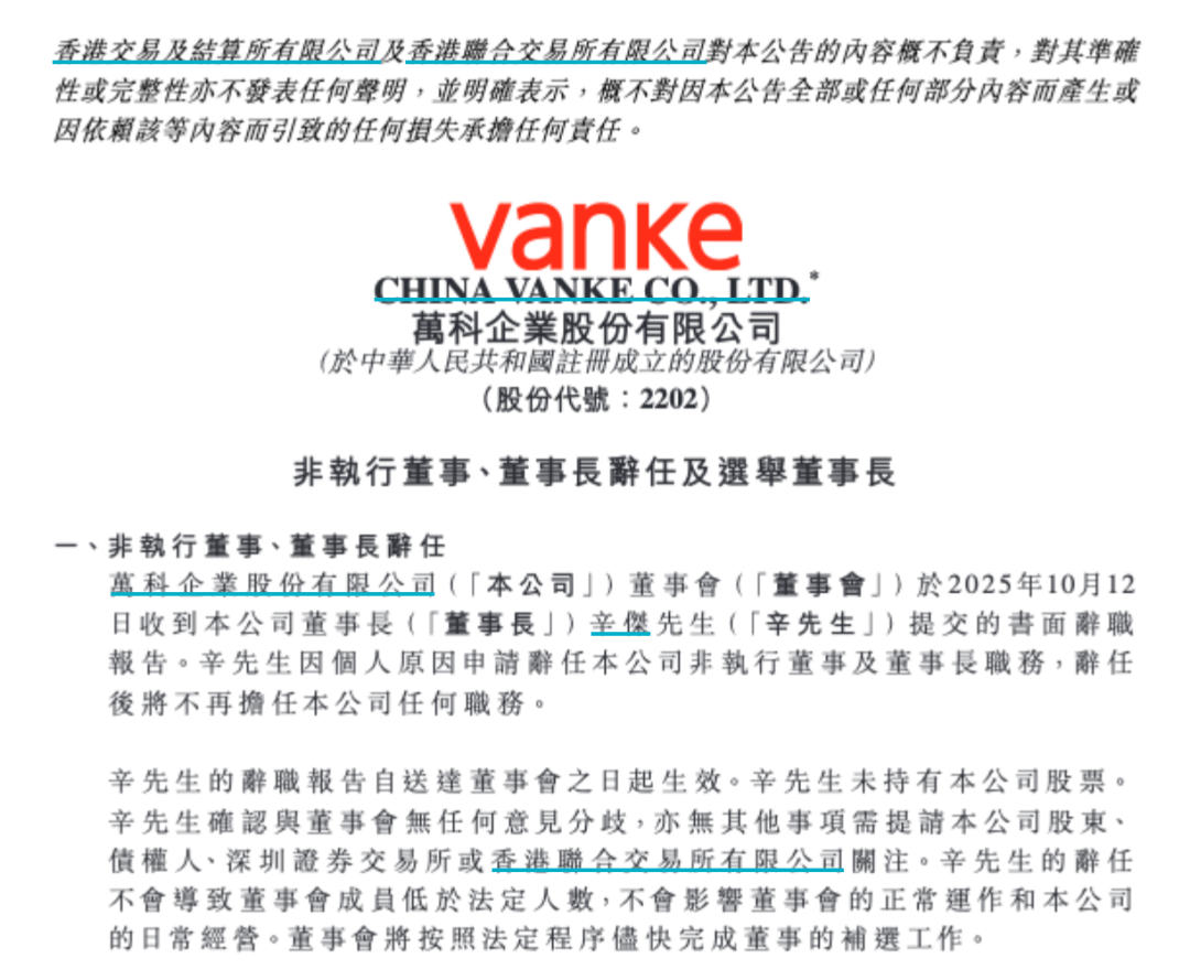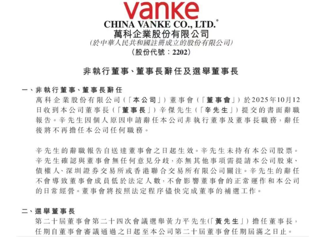 万科于2025年10月13日盘前发布重要人事变动公告。 万科公告称,万科董事会于2025年10月12日收到董事长辛杰提交的书面辞职报告。辛杰因个人原因申请 辞任公司非执行董事及董事长职务,辞任后将不再担任公司任何职务。辛杰辞任后,万科董事会选举黄 力平担任董事长,任期自董事会审议通过之日起至万科第20届董事会任期届满之日止。 2025年1月,深铁集团全面入主万科,辛杰正式成为万科董事长,掌舵这家大型房企。此后辛杰公开露 面的次数并不多,今年6月的股东大会上,辛杰曾对万科的发展现状对股东进行表态。 辛杰最近一次出现在万科的公开活动中,是今年8月29日出席深铁集团、万科集团与通力电梯在深圳南 山区举行的战略合作协议签署仪式上。 新任董事长仍然来自于大股东深铁。 当日,在深铁集团党委书记、董事长,万科集团董事长辛杰,万科集团商业与酒店事业部总经理、印力 公司总裁孙嘉,通力集团全球总裁、首席执行官 Philippe Delorme (菲利普)的共同见证下,深铁集团 投资中心总经理刘育兵,万科集团投资发展中心总经理李嵬,通力集团全球执行副总裁、通力大中华区 总裁包嘉峰,代表三方签署战略合作协议。 根据公告,黄力平出生于 ...