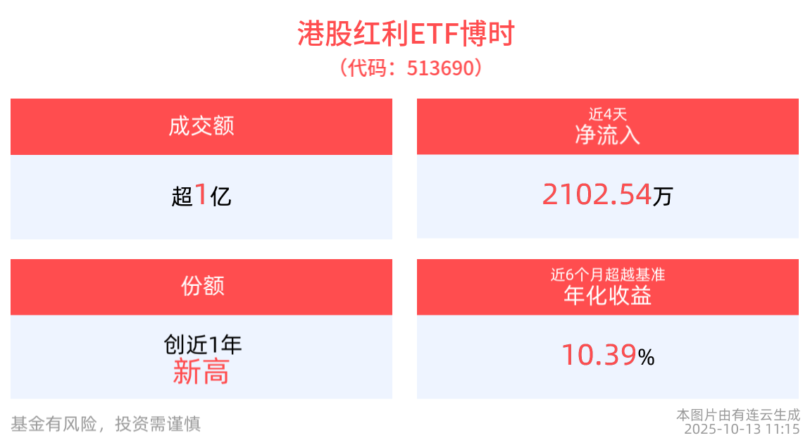截至2025年10月13日 11:15,恒生港股通高股息率指数下跌1.14%。成分股方面涨跌互现,统一企业中国领涨1.32%,农业银行上涨0.76%,中国燃气上涨 0.62%;信义玻璃领跌5.38%,兖矿能源下跌3.52%,中国平安下跌2.97%。港股红利ETF博时(513690)下跌1.02%,最新报价1.07元。拉长时间看,截至2025 年10月10日,港股红利ETF博时近2周累计上涨0.84%。 流动性方面,港股红利ETF博时盘中换手2.7%,成交1.43亿元。拉长时间看,截至10月10日,港股红利ETF博时近1周日均成交2.63亿元。 据报道,在2025年国庆中秋双节叠加的楼市传统旺季中,上海楼市的新房市场和二手房市场表现分化明显,新房市场延续政策红利热度依然高涨,二手房市 场则受假期分流等影响明显降温。同策研究院联席院长宋红卫称,2025年10月1日至10月7日,上海新房累计成交909套,同比2024年国庆7天上涨了78.9%; 而二手房在2025年国庆7天成交780套,同比下跌63.7%。 近期,消费领域迎来多重政策利好。海通国际指出,大消费板块短期领涨格局已经确立,特别是在政策支持下表现更优。其 ...